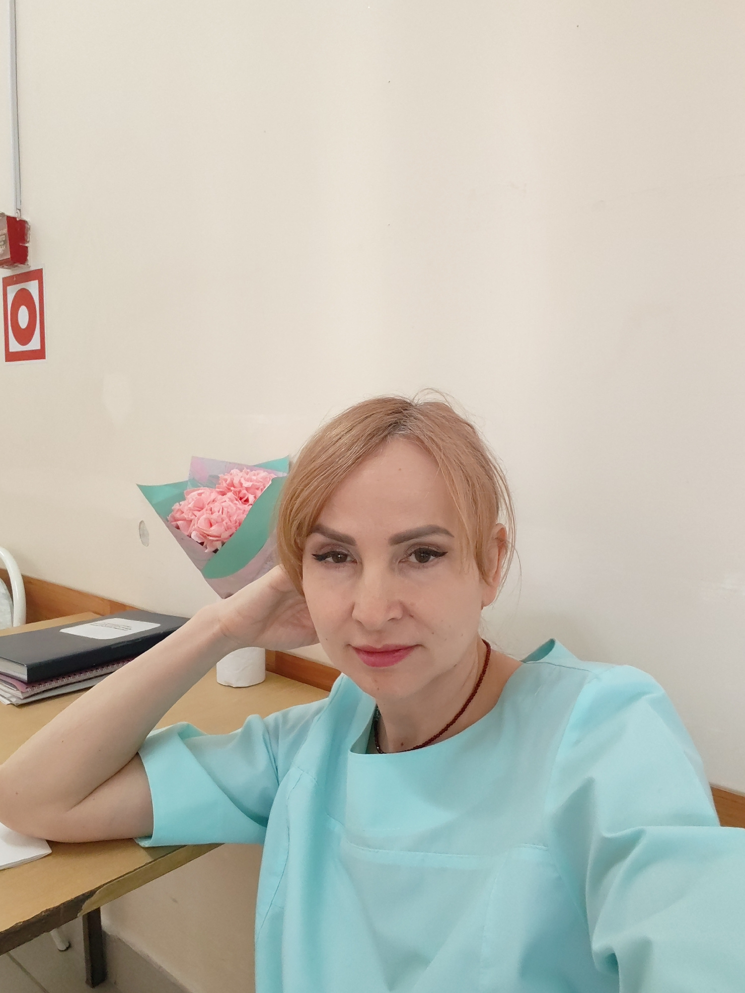 A woman is sitting at a desk indoors. She has blonde hair and is wearing a light blue scrub top and a red necklace. Her left arm is bent at the elbow and her hand is supporting her head. On the desk t…read more