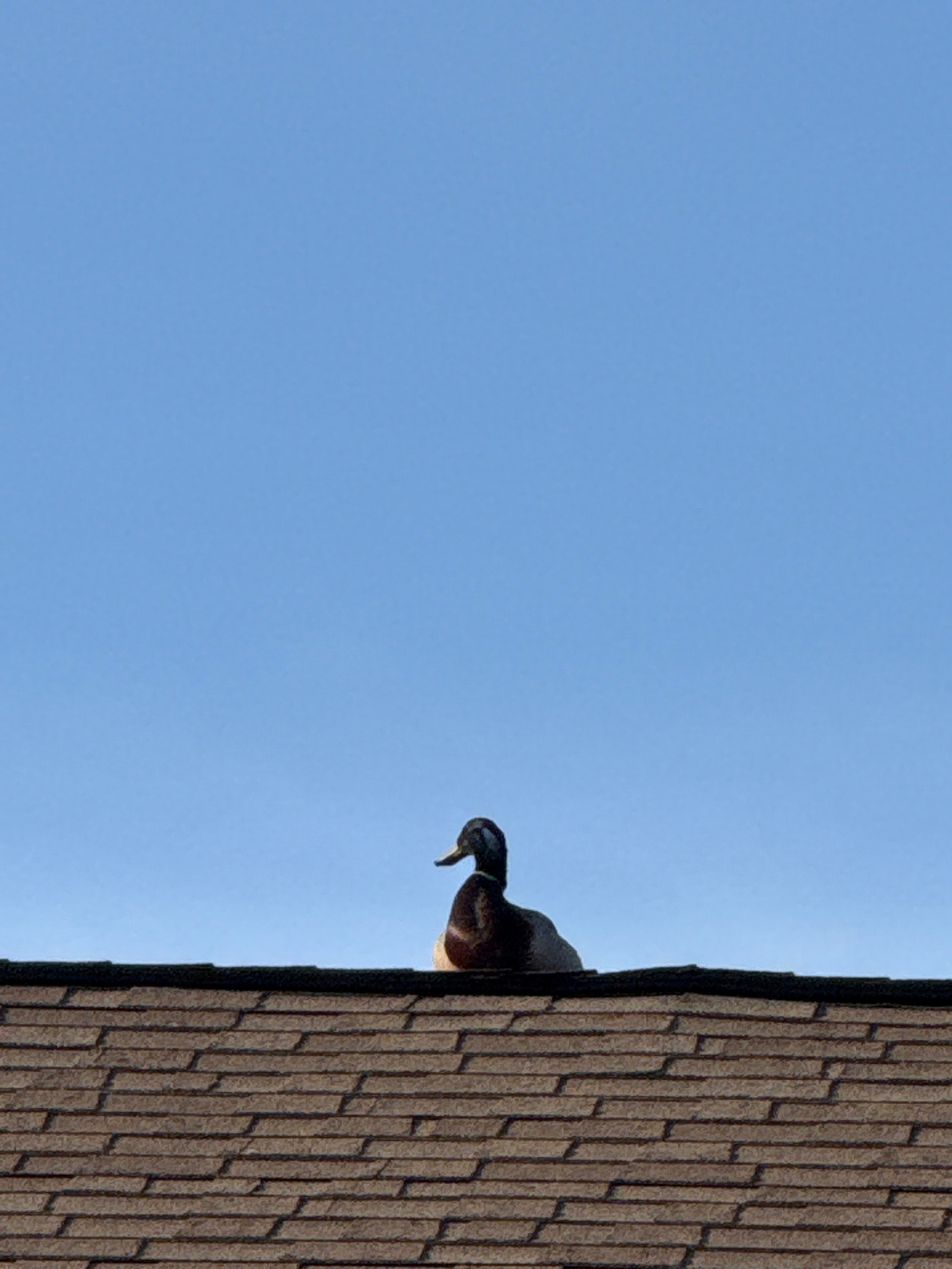 The image displays a duck partially visible at the edge of a residential roof against a bright, clear blue sky. The duck's head, neck, and upper body, appearing dark in plumage with lighter shades on…read more