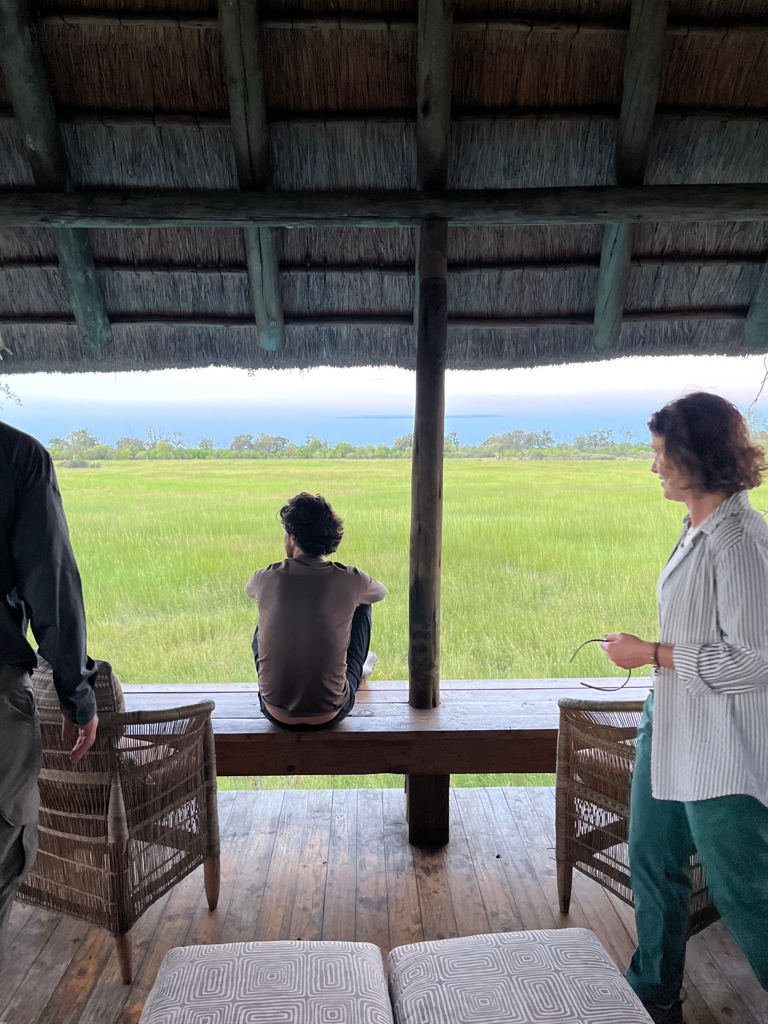 Two adults are on a wooden deck in an open structure with a thatched roof. One adult, wearing a striped shirt and green pants, stands and holds glasses. The second adult sits cross-legged facing a gra…read more