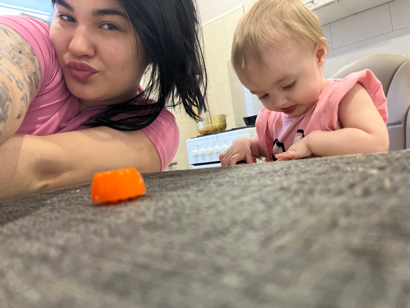 A selfie taken from a low angle shows a woman and a child at a kitchen counter in Chaikovsky, Russia. The woman, with black hair and a pink t-shirt, is on the right side of the frame. A child with blo…read more