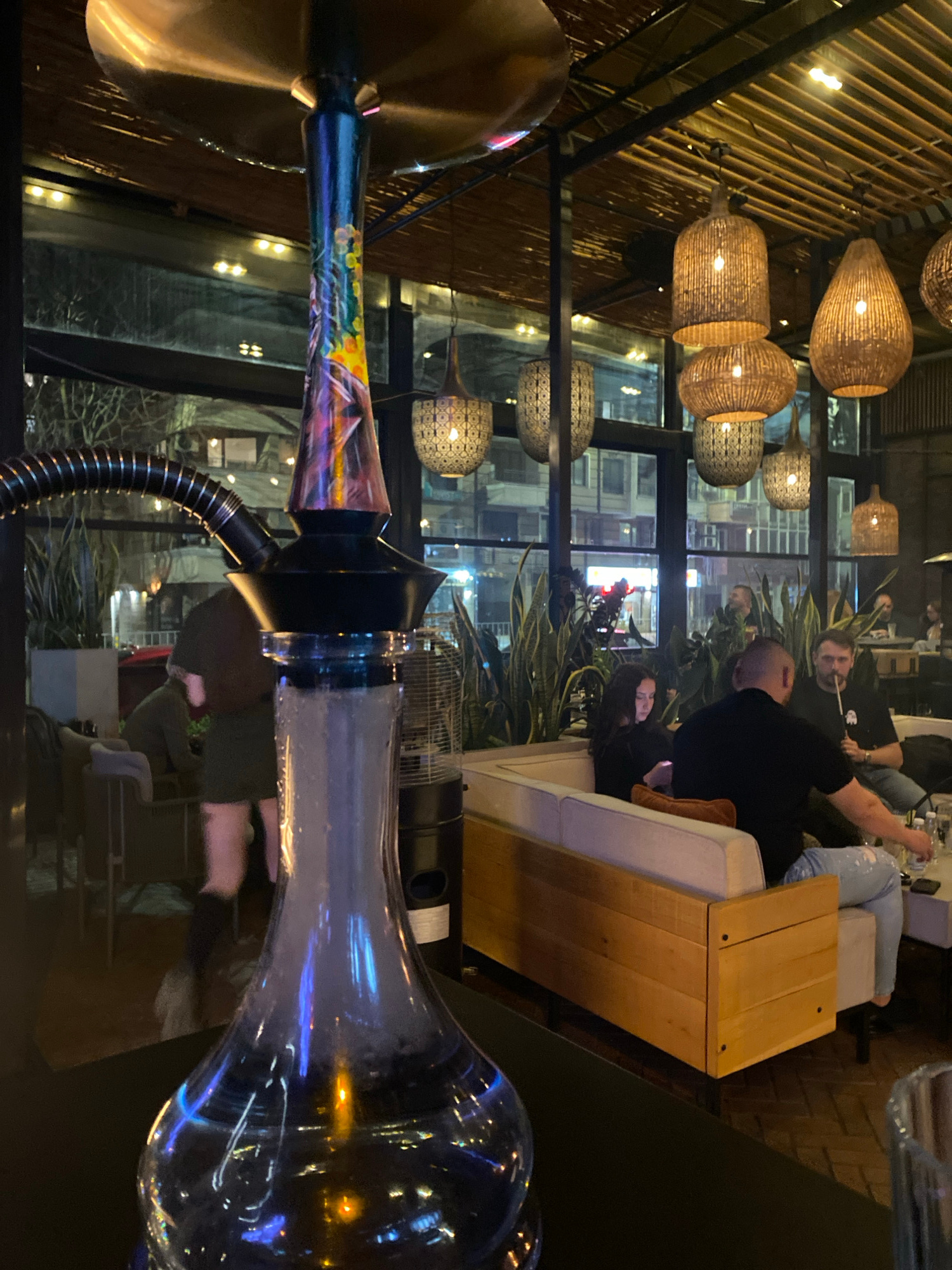 The image depicts an indoor scene, likely a lounge or restaurant, with a group of people engaging in social activity. In the background, individuals are seated on cushioned benches, some smoking hooka…read more