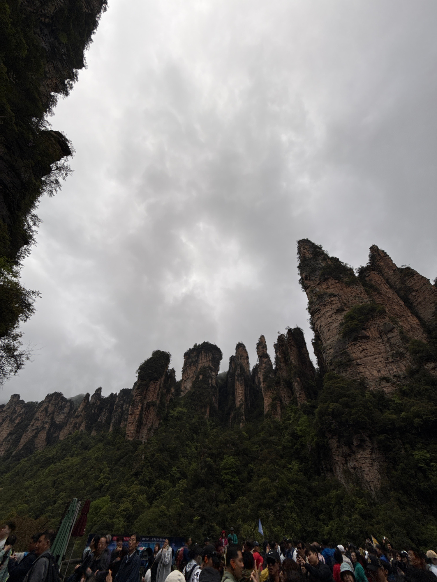 Looking up at rock formations in Luoguta, China, there are numerous people on the right side of the image, with the top of the rock formation visible, with a cloudy grey sky above. Rock formations are…read more