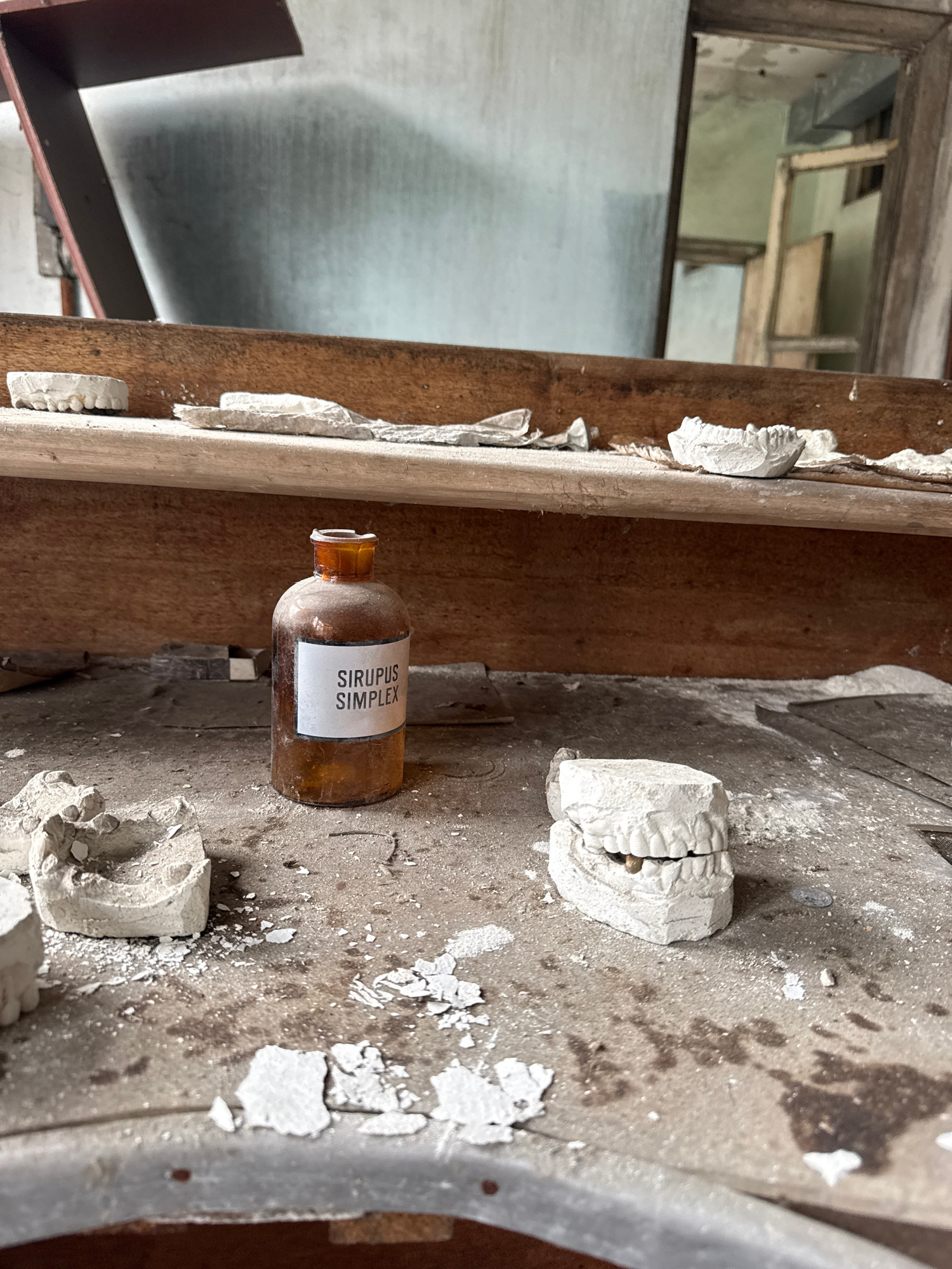 In a dilapidated interior, likely within the city of Prypiat, Ukraine, an amber-colored glass bottle labeled "Sirupus Simplex" rests on a dusty, deteriorating surface. The surface is covered in remnan…read more