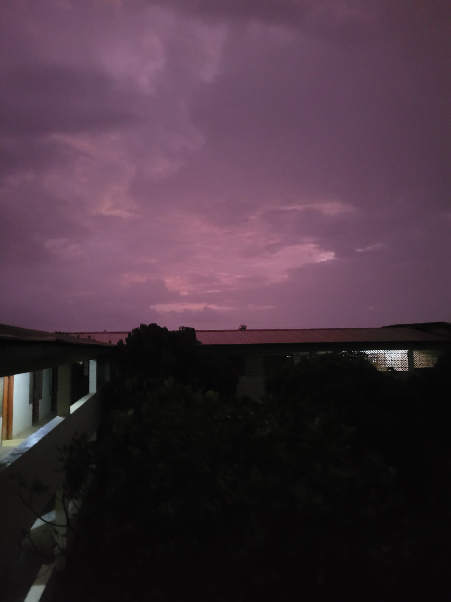 The image presents a nighttime view in Jos, Nigeria, focusing on the sky and surrounding buildings. The sky is a dominant feature, exhibiting a distinct purple hue with textured clouds. Adjacent to th…read more