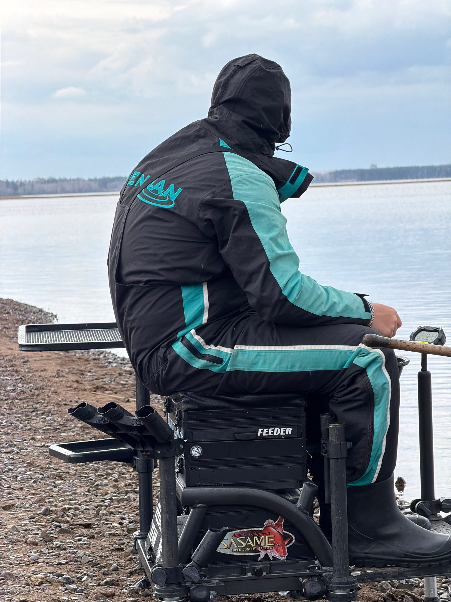 A person in a black and light blue jacket and black boots sits in a black metal fishing chair on a pebble-covered shore. The person is facing away from the camera and toward a large body of water undeβ¦read more
