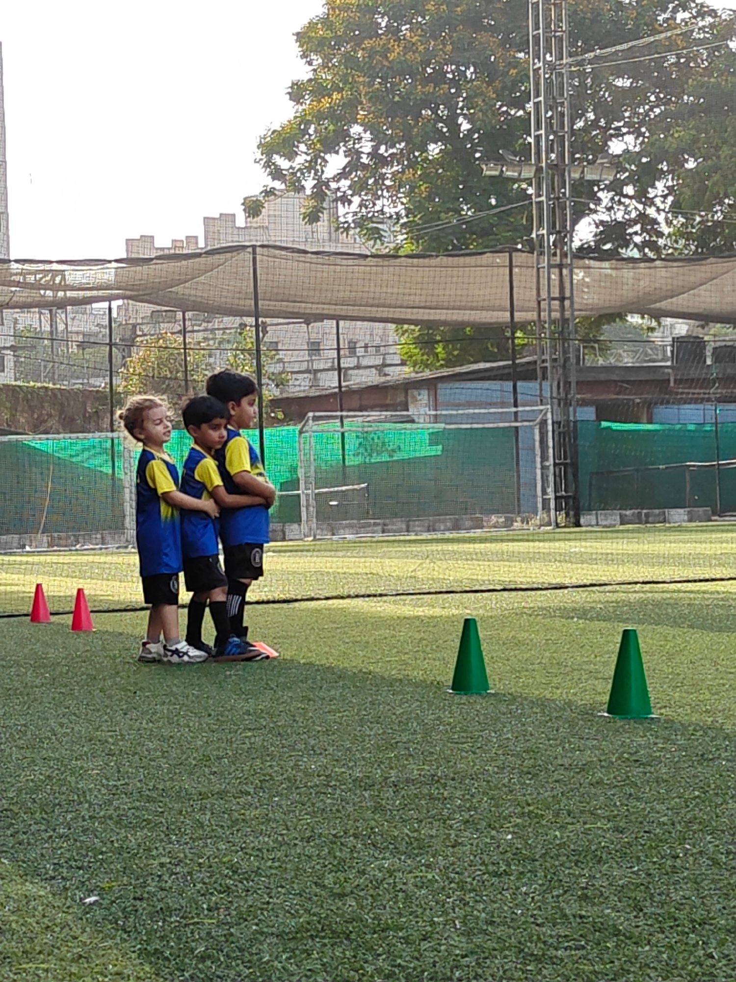Three children in matching blue and yellow jerseys stand together on a green turf field. Orange cones are visible to their left, and green cones are to their right. In the background, there's a struct…read more