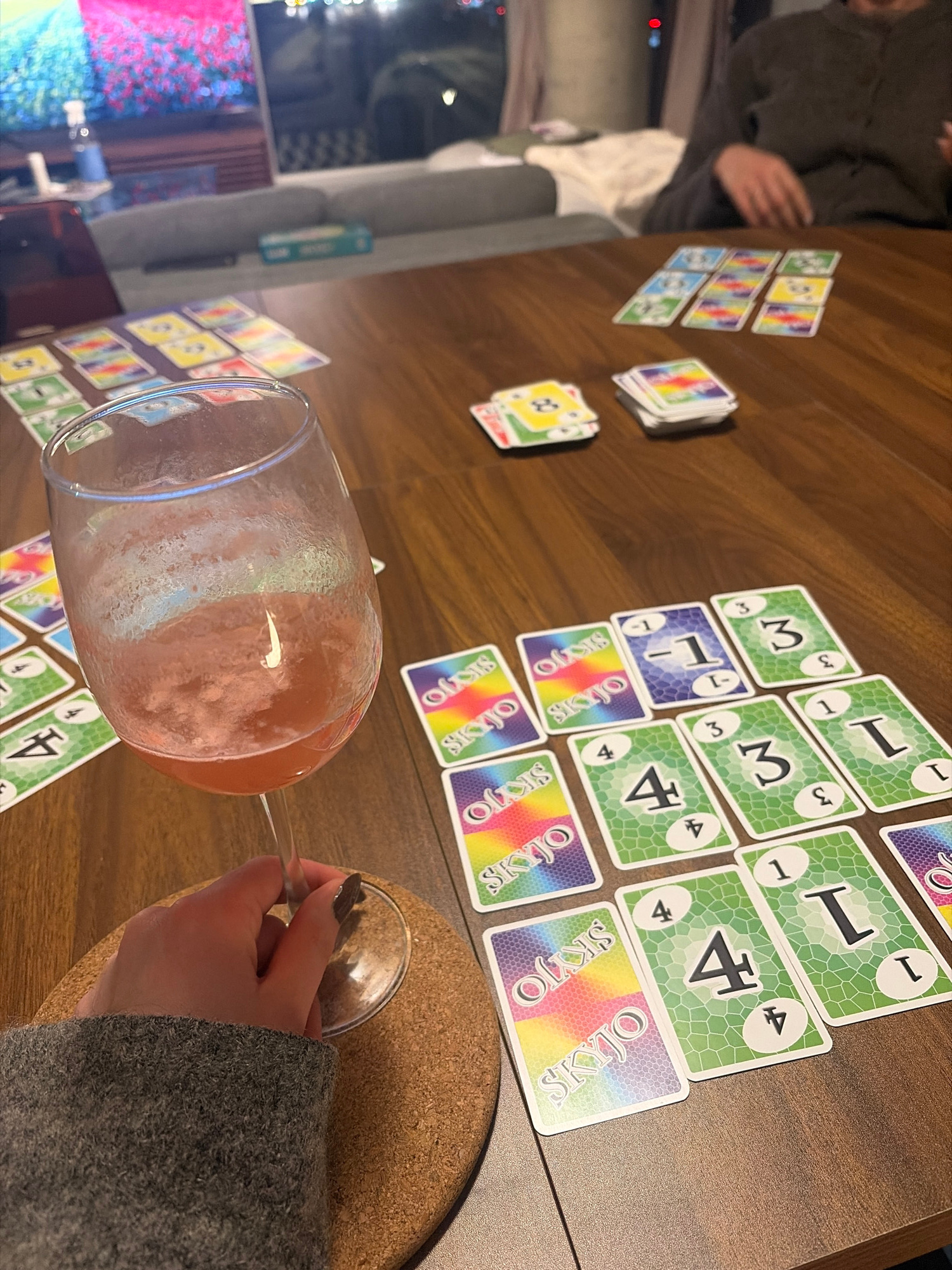 The image shows a game of Skyjo being played on a wooden table. Several cards are laid out, including some numbered "1", "3", and "4", as well as "SKYJO" cards. A stack of cards and a discard pile can…read more