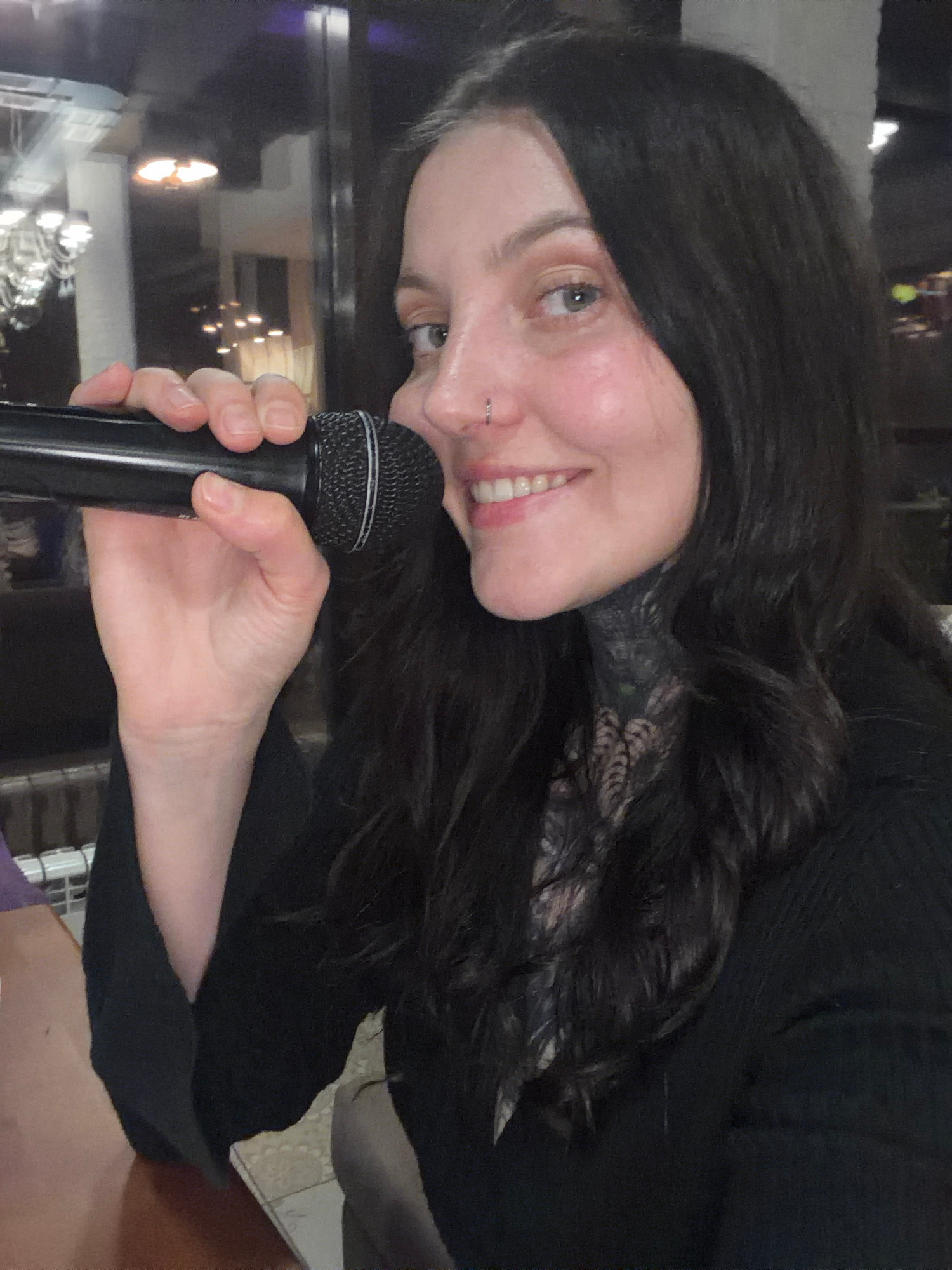 A pale-skinned woman with dark hair smiles while holding a microphone. Her hair partially covers a tattoo on the side of her neck. She wears a dark, long-sleeved top. Reflections indicate a building i…read more