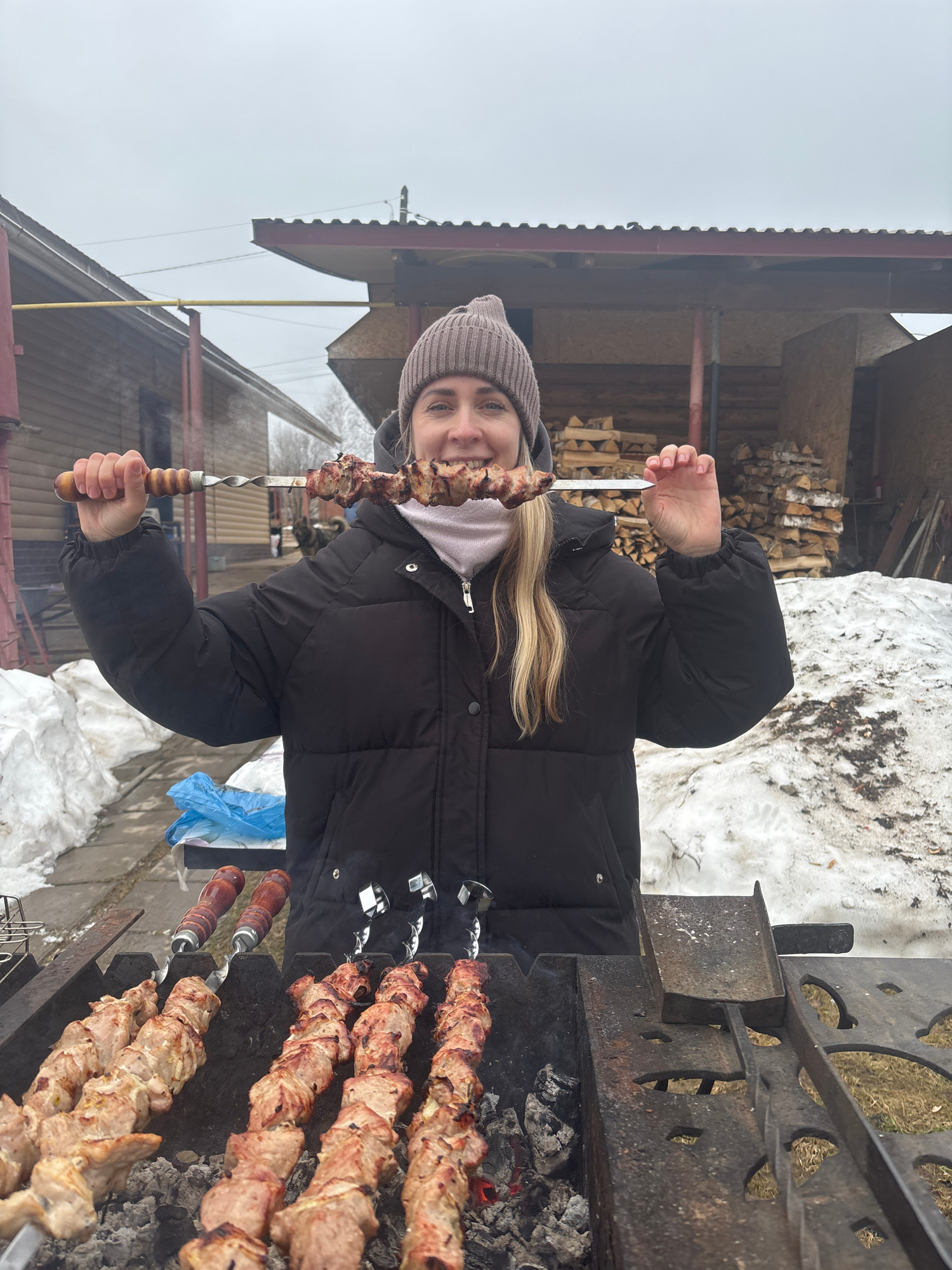 A young woman with blonde hair and a beanie is holding a skewer of grilled meat in front of her face. She is standing next to a grill with several skewers of meat cooking over hot coals. In the backgr…read more