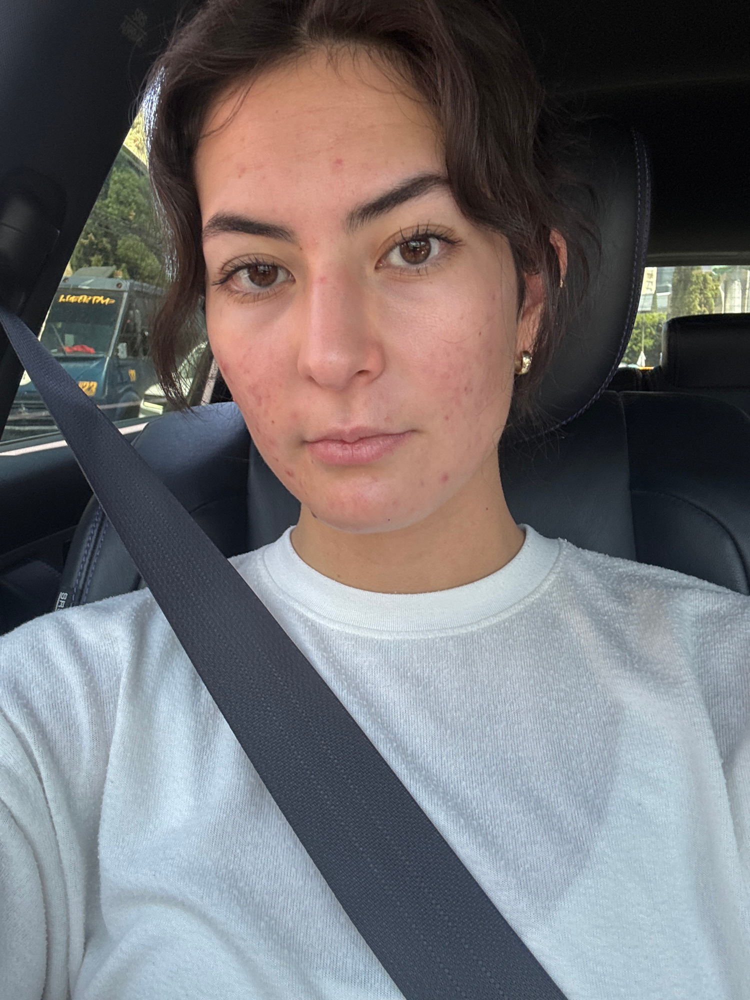 A young woman with dark hair and brown eyes is in a car, wearing a white sweatshirt and a gray seatbelt. Her face shows some acne. Outside the car window, a green van with yellow lettering is visible.…read more
