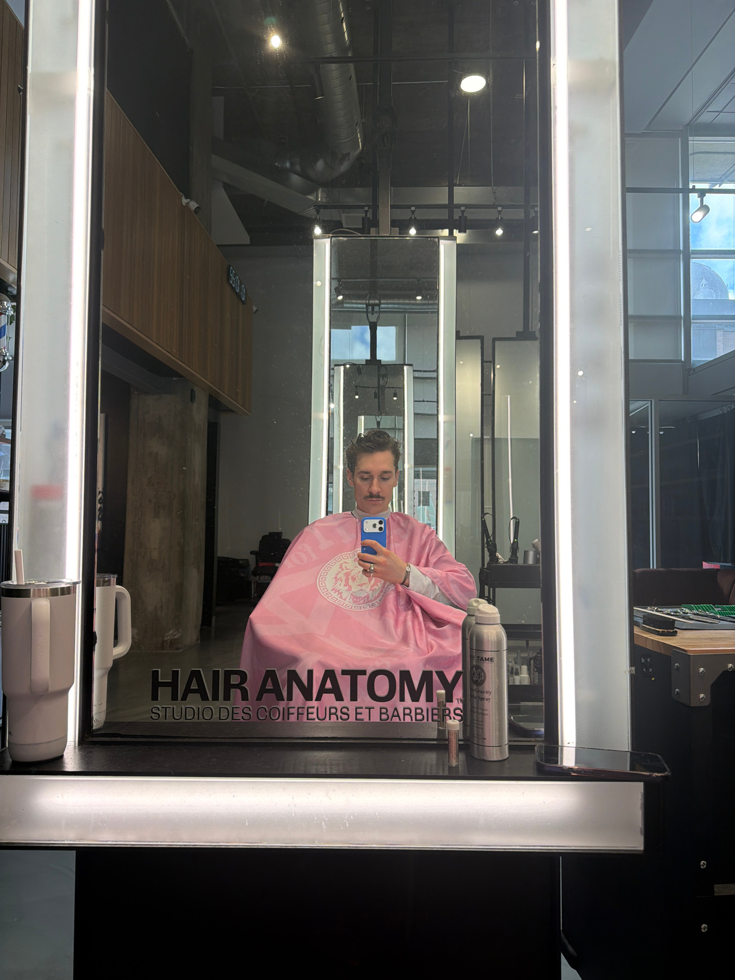 The image shows a man in a pink salon cape holding a blue smartphone, reflected in a salon mirror. The mirror displays the salon name "HAIR ANATOMY STUDIO DES COIFFEURS ET BARBIERS". Based on the salo…read more