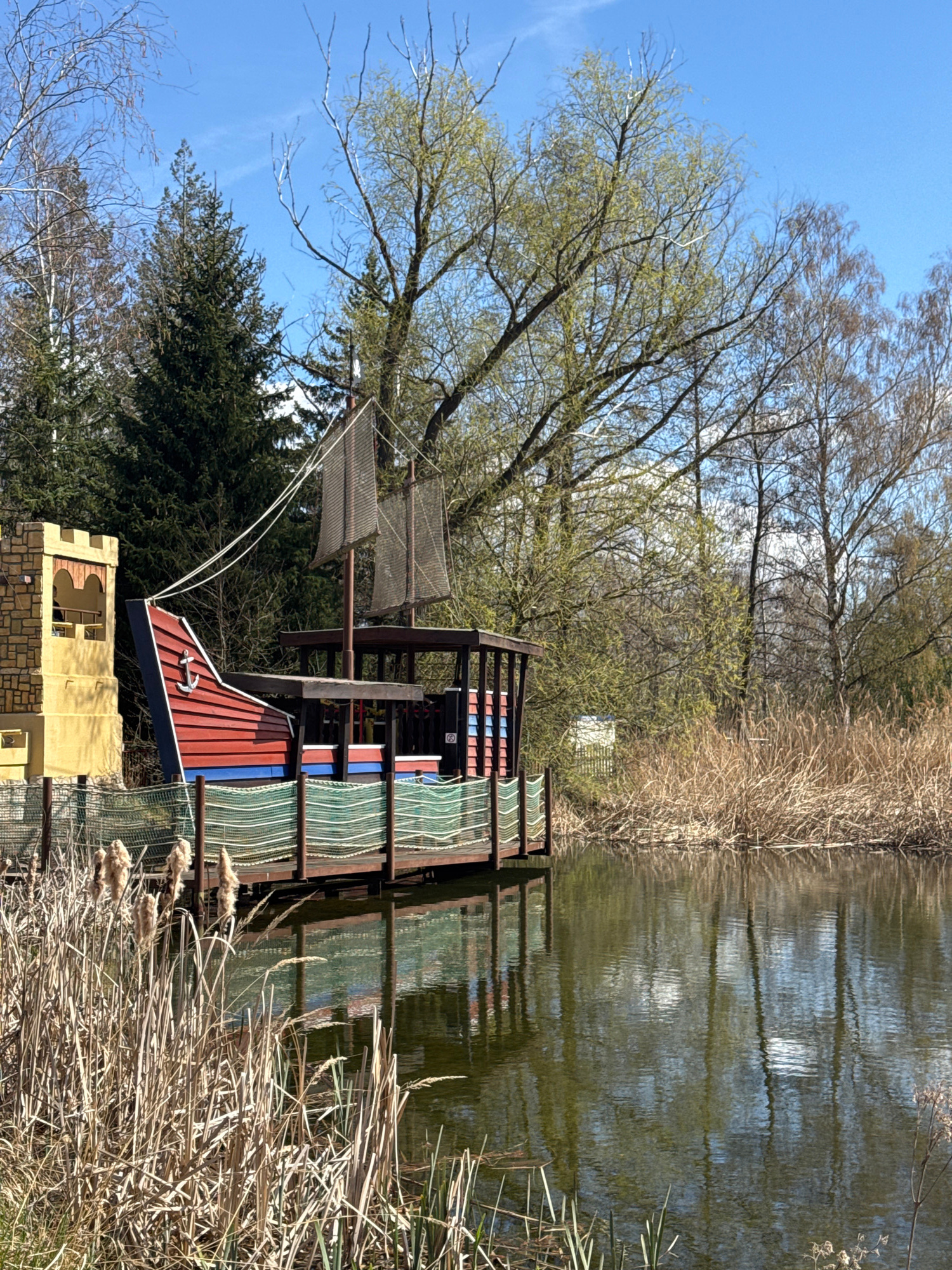 The image depicts a children's playground structure shaped like a ship, situated on the edge of a body of water, likely a pond or small lake. The ship structure features wooden framing, netting for sa…read more