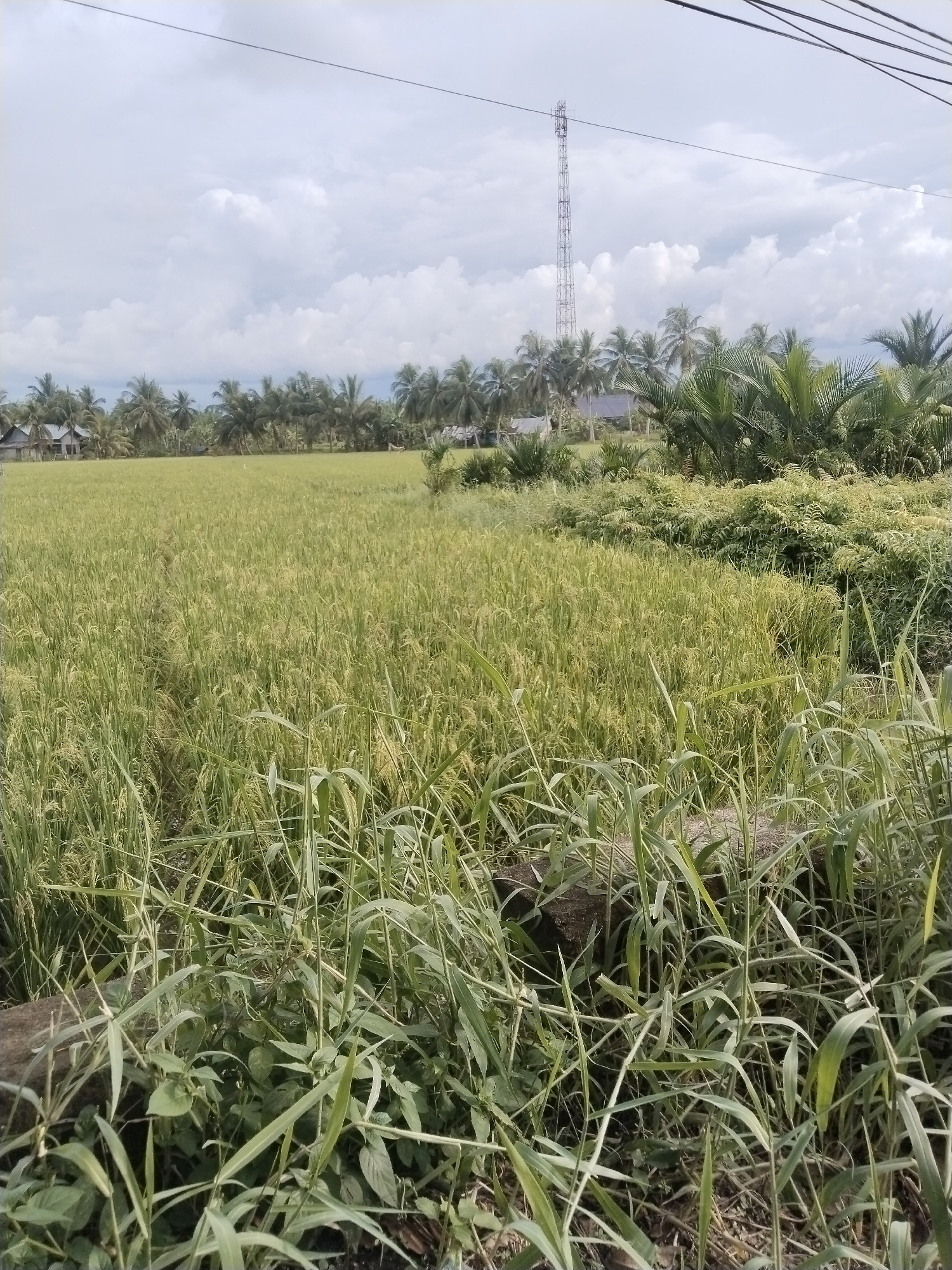 The image shows a view of a rice paddy in a rural area. The rice stalks are mostly green with some yellowing, indicating maturity. In the background, there is a row of palm trees and some houses. Therβ¦read more