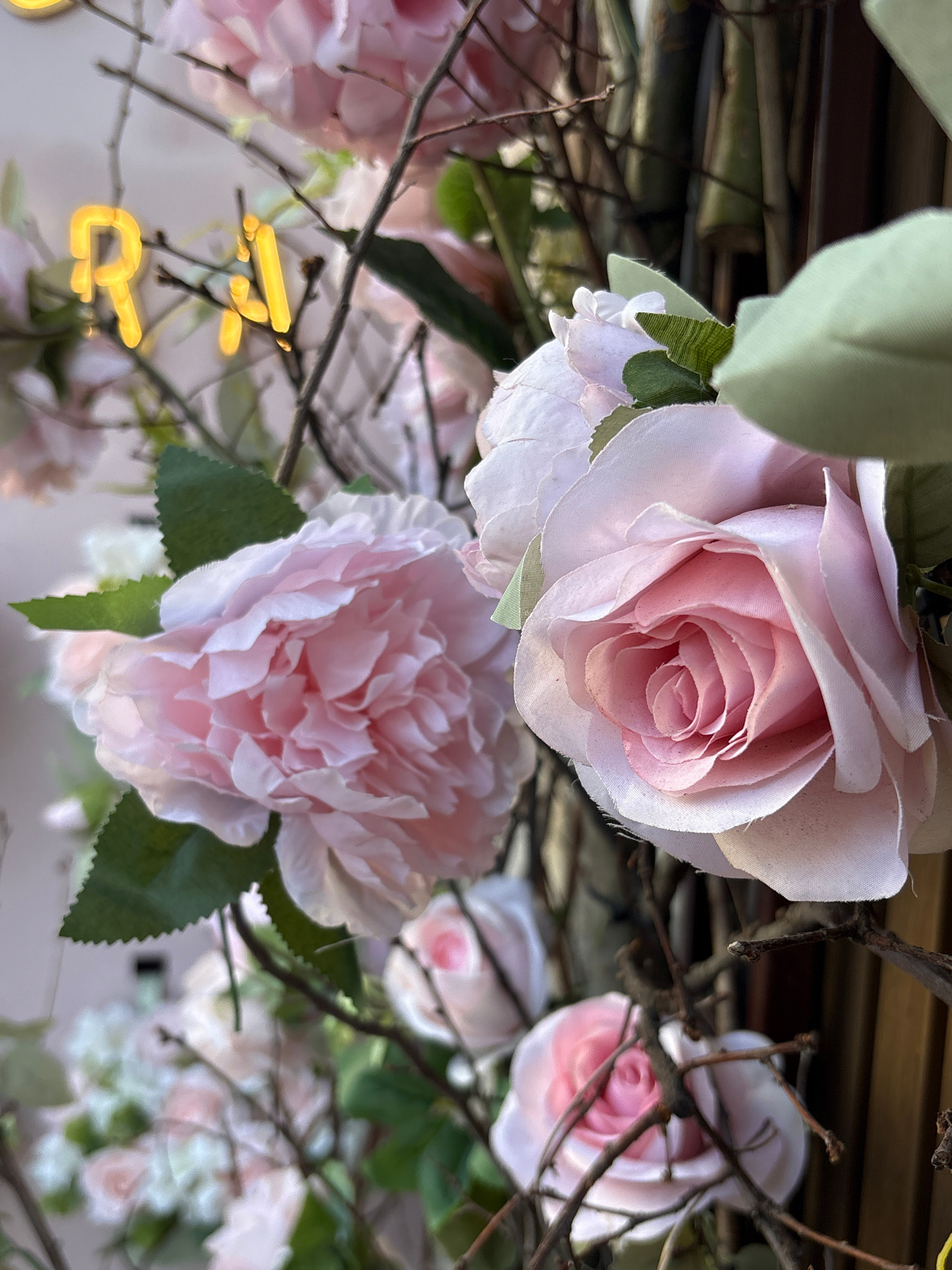 This image captures an upward view of a decorative arrangement, likely within an interior or a sheltered outdoor space in Kragujevac, Serbia. The primary subjects are artificial pink flowers and inter…read more