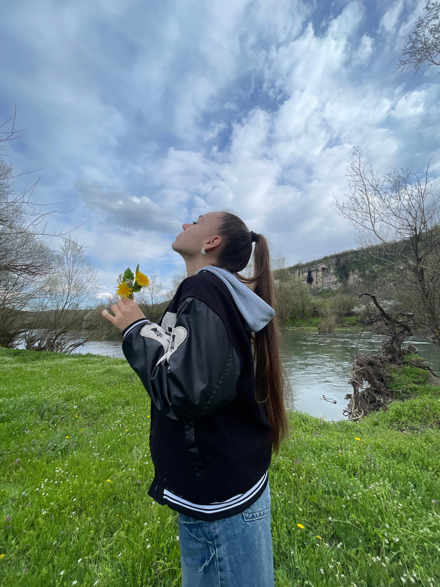 A young woman stands in a grassy area by a river. She has long brown hair pulled back in a ponytail and is wearing jeans and a black jacket with white stripes on the sleeves. She is holding a small bu…read more