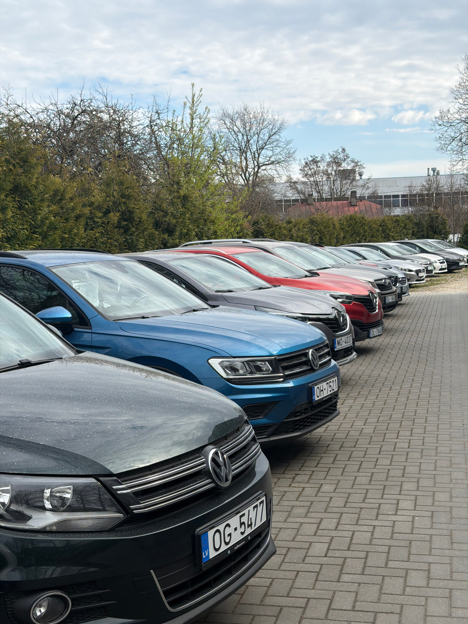 The image depicts a long line of numerous cars, primarily modern SUVs or crossovers, parked outdoors on a paved surface. The viewpoint is slightly elevated, looking along the row of vehicles that rece…read more