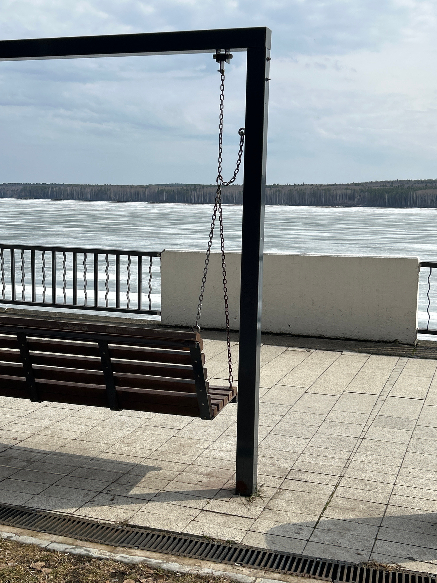 A swing bench overlooks the Kama River in Chaikovsky, Russia. The bench, suspended by chains from a black metal frame, sits on a paved walkway near a drainage grate. Beyond a short, white wall and met…read more