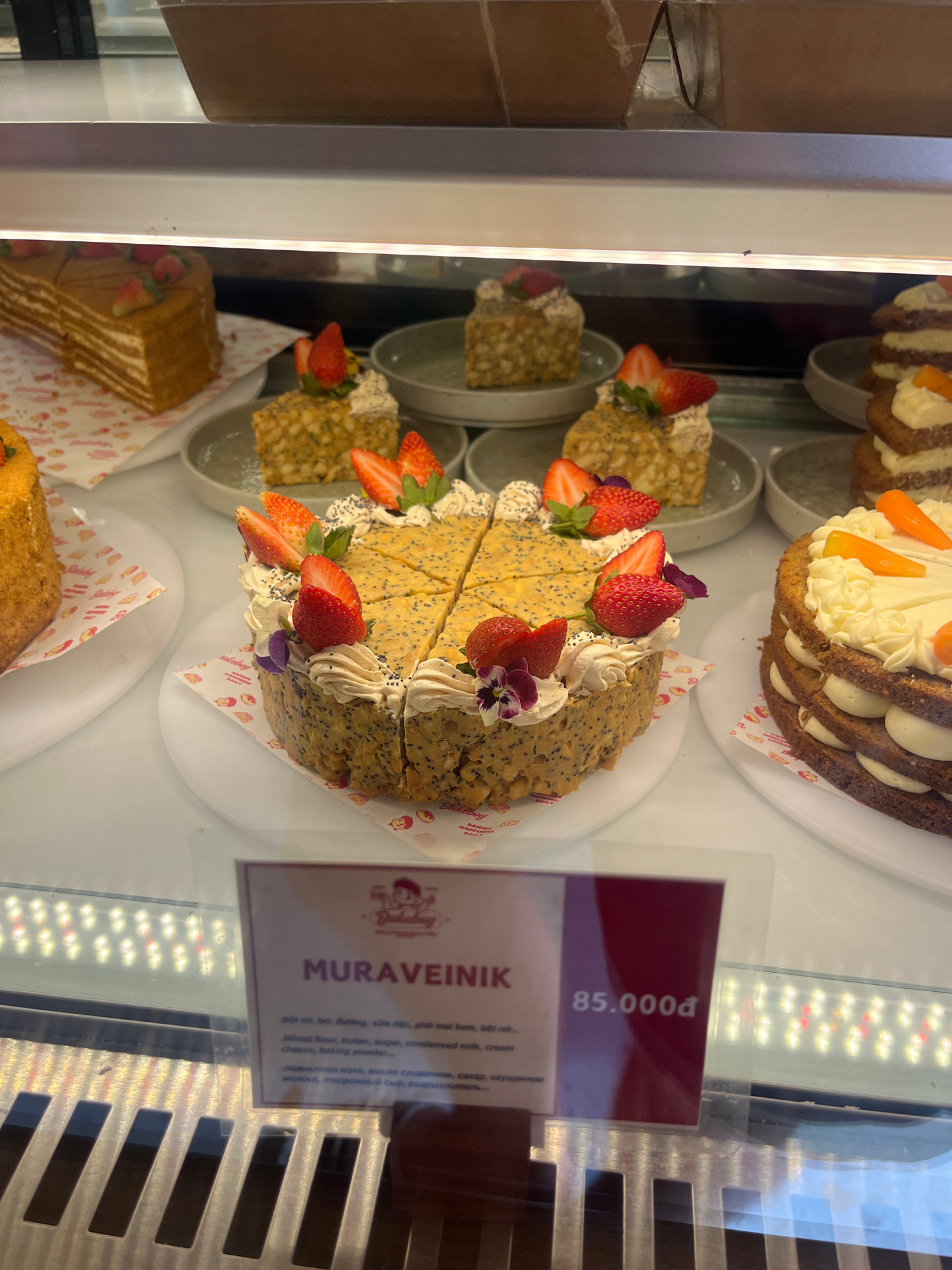 The image shows a display case filled with various cakes, potentially in a bakery or cafe in Bắc Nha Trang, Vietnam. In the foreground, a cake labeled "MURAVEINIK" is displayed with a price tag of 85,…read more