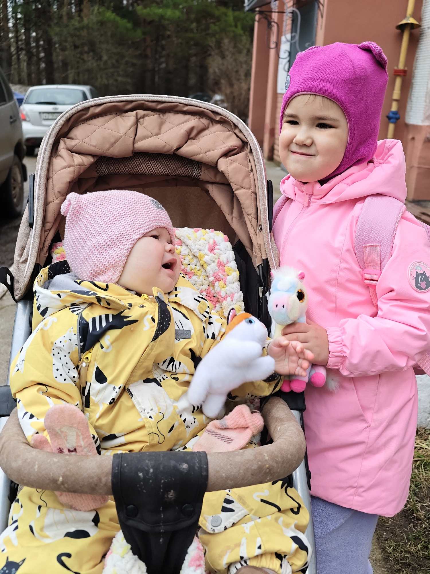 Two young girls are outdoors near what appears to be a building and some parked cars. One girl, wearing a pink hat and pink jacket with a small backpack, is standing next to a stroller. She is holding…read more