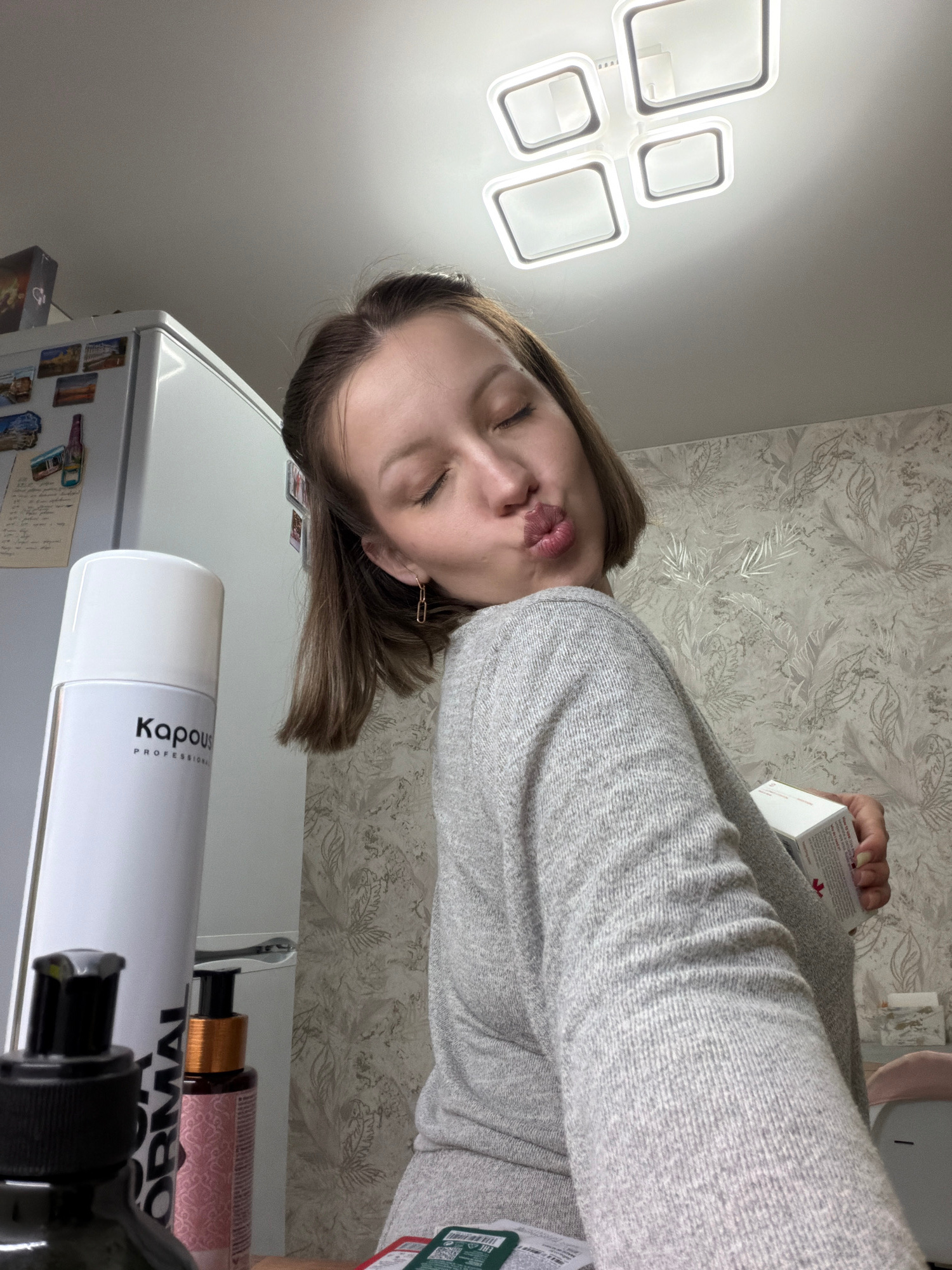 A photograph taken indoors in Reshetnikovo, Russia, shows a young woman with shoulder-length brunette hair and fair skin. She is wearing a light gray sweater and is positioned so that her face is angl…read more