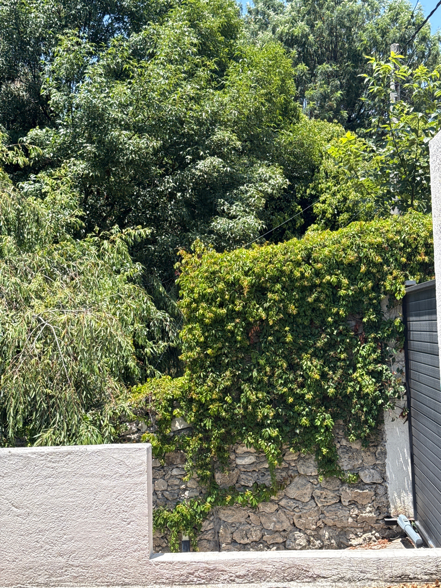 The image shows a stone wall partially covered in green foliage, adjacent to a white stucco wall. A portion of a metal overhang or awning is visible at the top of the image. Lush green trees and folia…read more