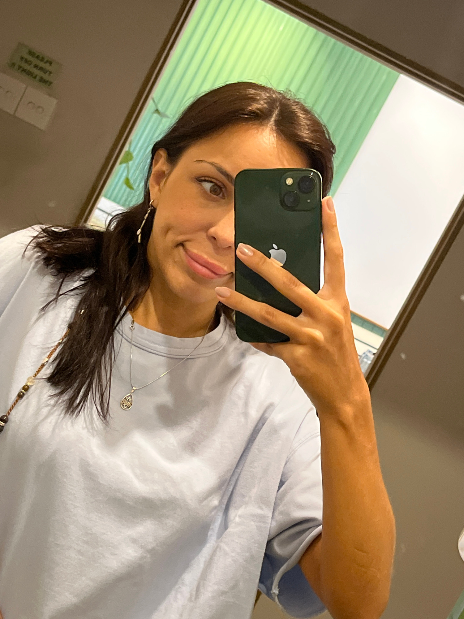 A woman is taking a selfie in front of a mirror, holding a dark green iPhone. She has dark brown hair, fair skin, and is wearing a light blue t-shirt and a silver necklace. The background visible in t…read more