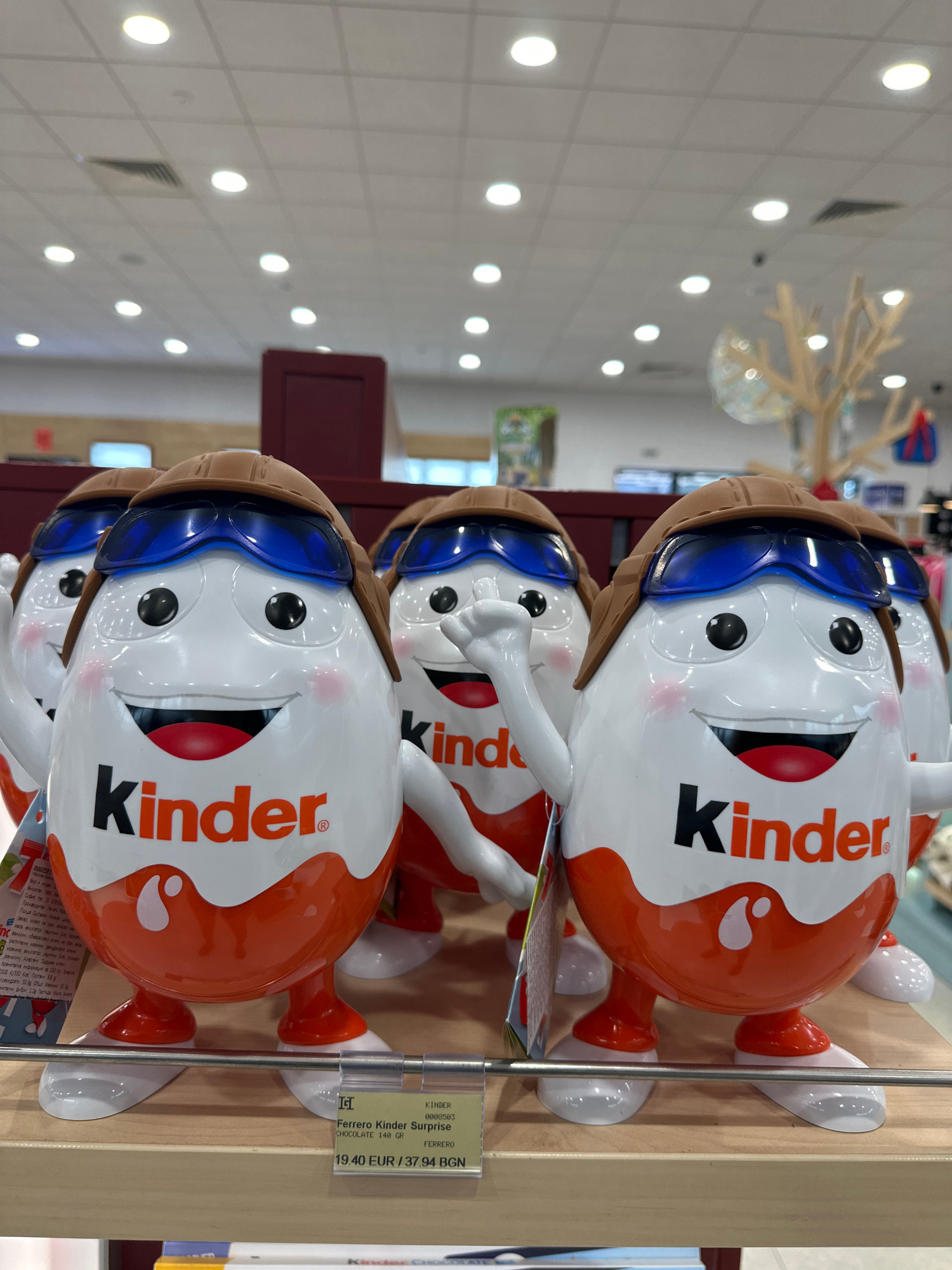 The image shows a shelf in a store, displaying multiple Kinder Surprise chocolate eggs in decorative, character-shaped packaging. The packaging features a cartoonish face with goggles and the "Kinder"…read more