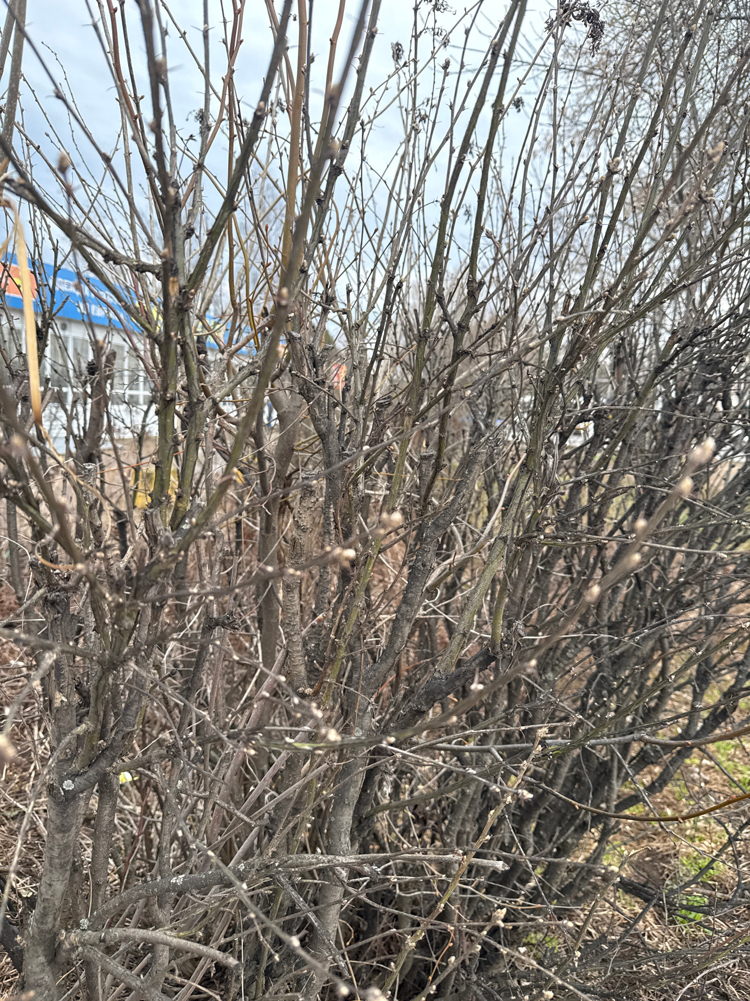 The image depicts a dense network of bare tree branches against a backdrop of a pale sky. The branches are varying shades of brown and gray, with some showing small buds or sprouts. In the background,…read more