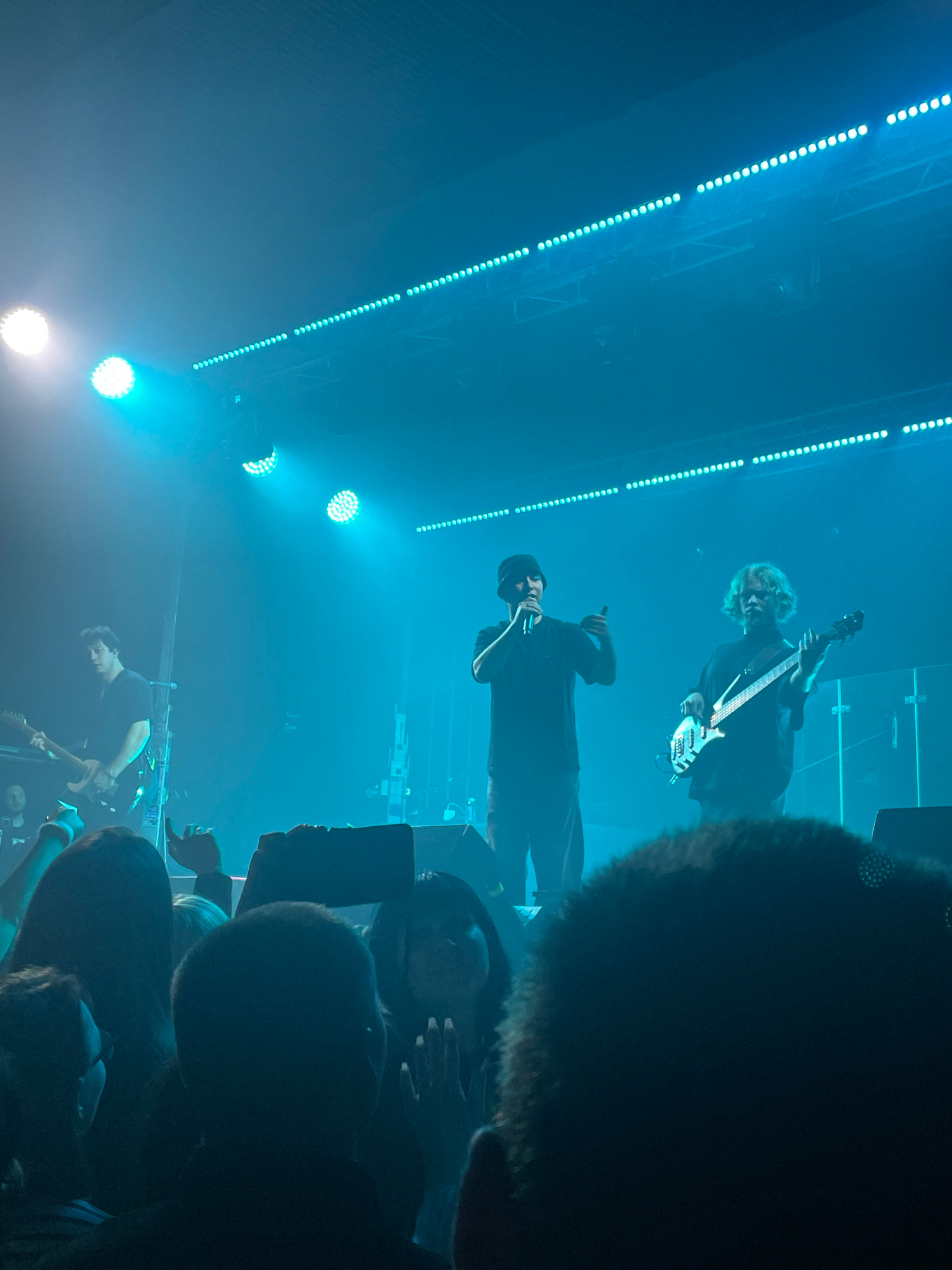 The image shows a band performing on stage at a concert. There are lights in the background and several members of the audience are visible in the foreground. The location is not identified, and no me…read more