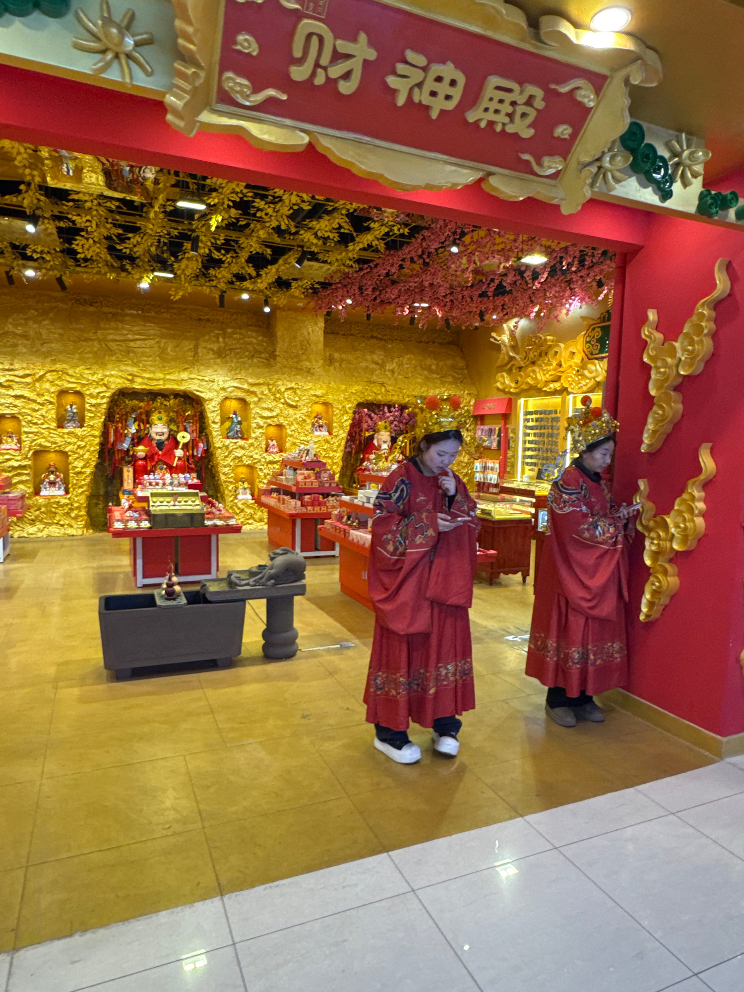 Two individuals wearing traditional red garments are standing indoors, likely in a commercial or cultural setting. The background features ornate golden decorations, a large sign with Chinese characte…read more