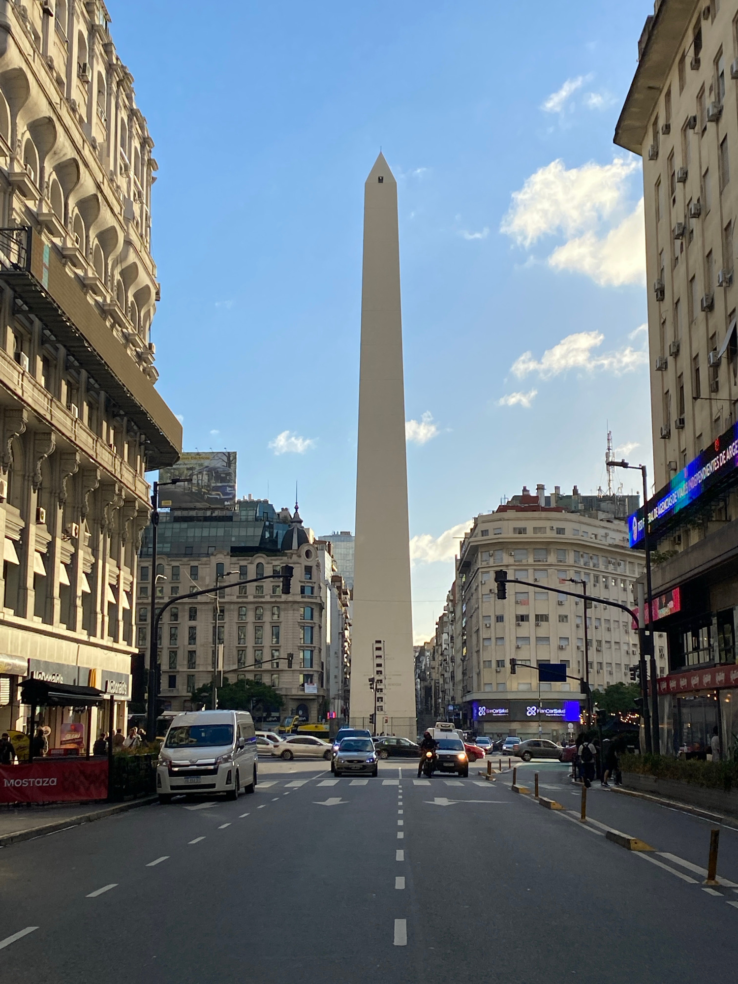 The image captures a vibrant street scene in Buenos Aires, Argentina, dominated by the iconic Obelisco de Buenos Aires, a tall, slender white monument, rising vertically towards a bright blue sky withβ¦read more