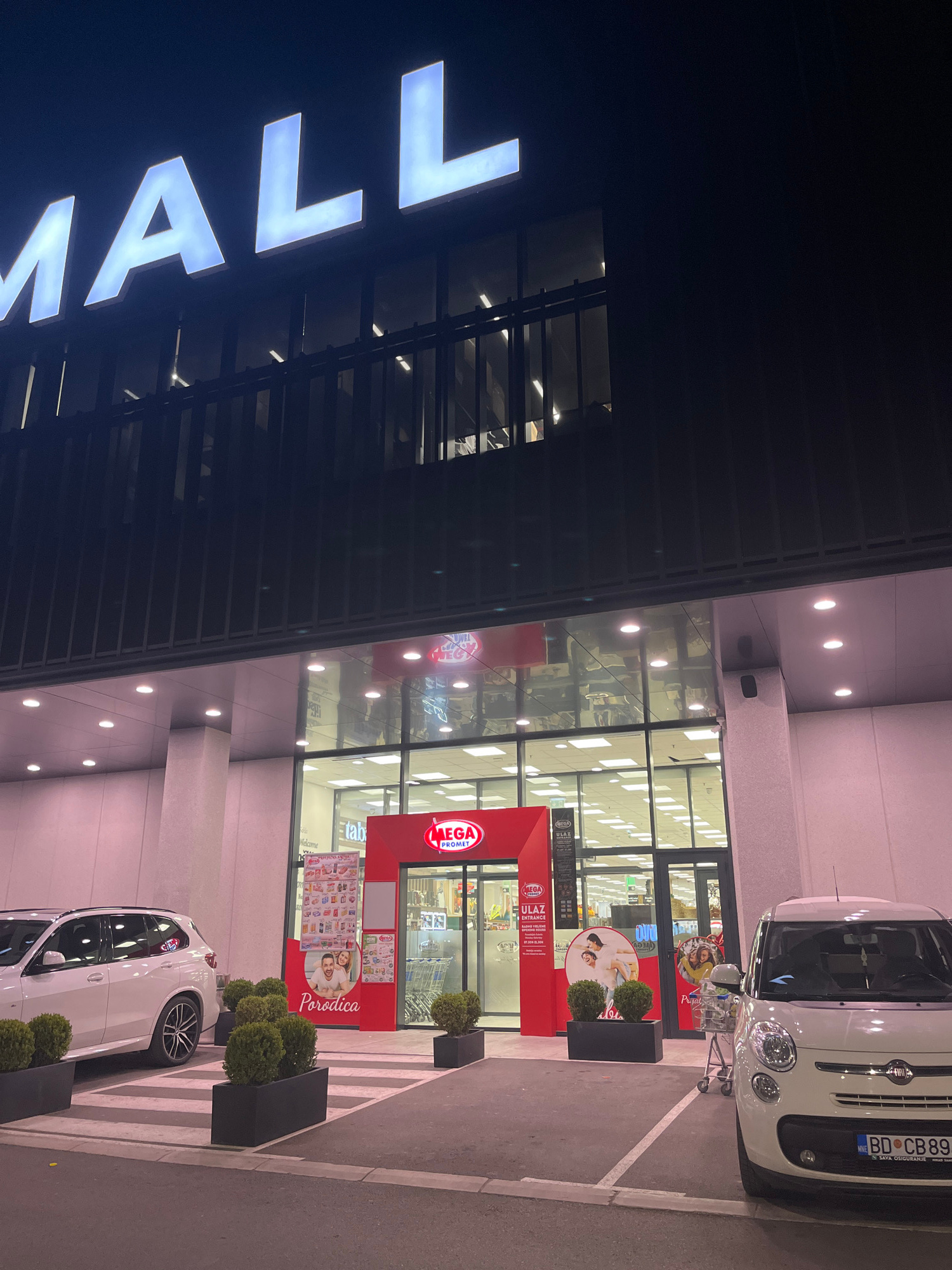 The image depicts the exterior of a Mega Promet supermarket. The supermarket entrance is marked by a red archway with “MEGA PROMET” branding. A sign reading “ULAZ ENTRANCE” is visible. Outside, there…read more