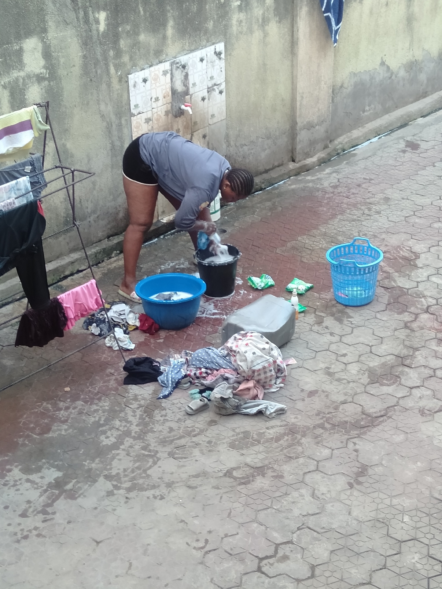 An outdoor scene in Shangisha, Nigeria, shows a woman engaged in handwashing laundry. She is positioned centrally, bent over, with her hands immersed in a black bucket filled with soapy water and clot…read more