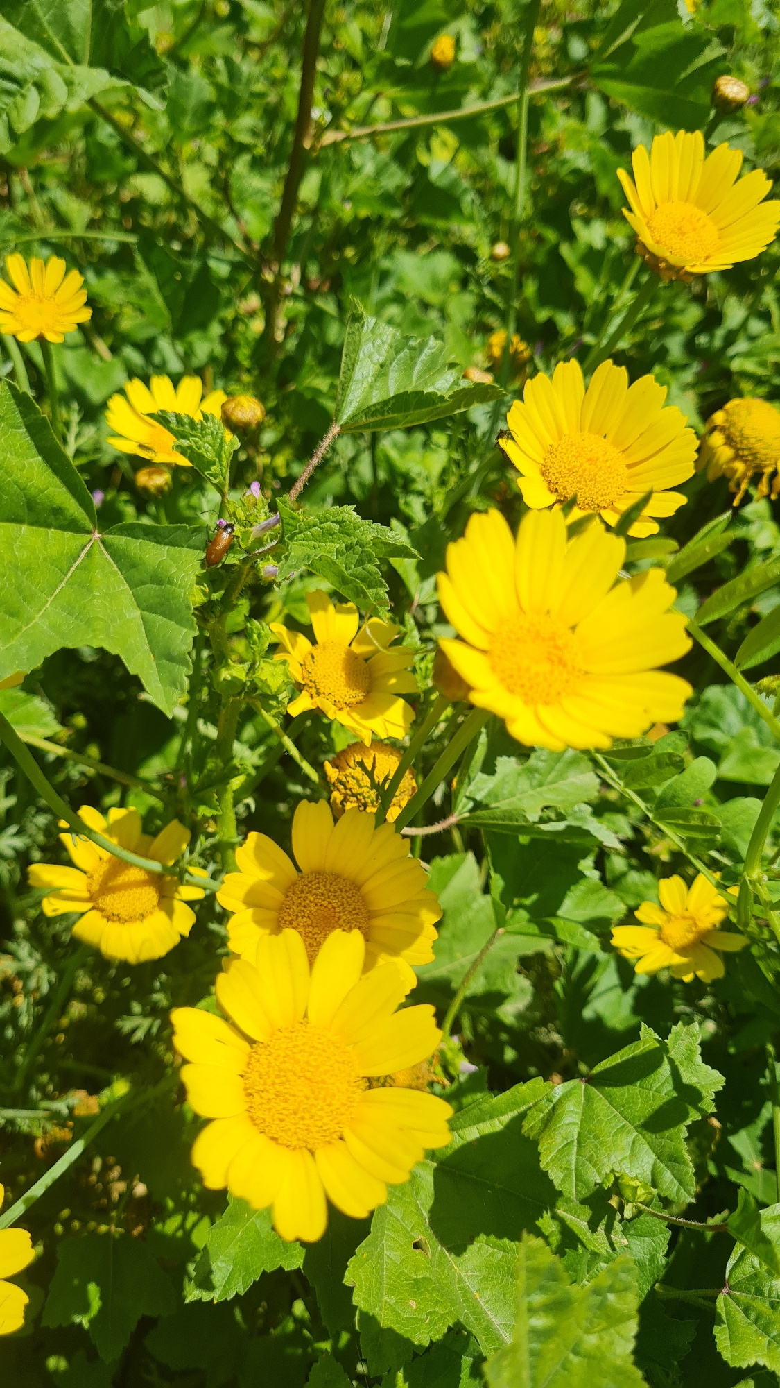 The image shows a patch of bright yellow daisy-like flowers growing amongst various green plants. The scene is sunlit, casting shadows across the foliage. A small brown beetle is visible on a leaf. Thβ¦read more