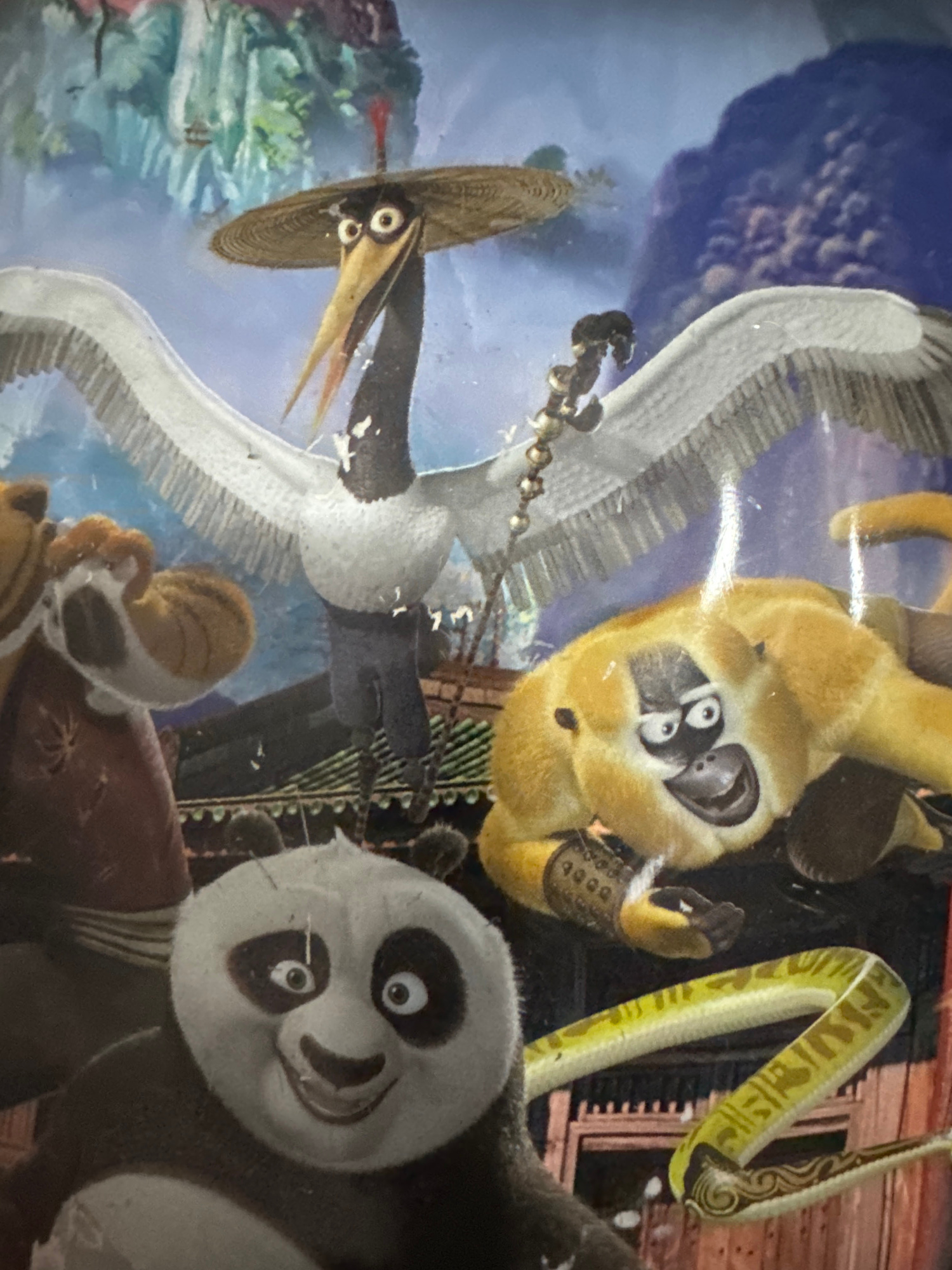 The image depicts characters from the "Kung Fu Panda" franchise. Crane is shown wearing a conical hat, Mantis is resting on Po's shoulder, Monkey is upside down, and Viper is near Monkey and Po. The b…read more