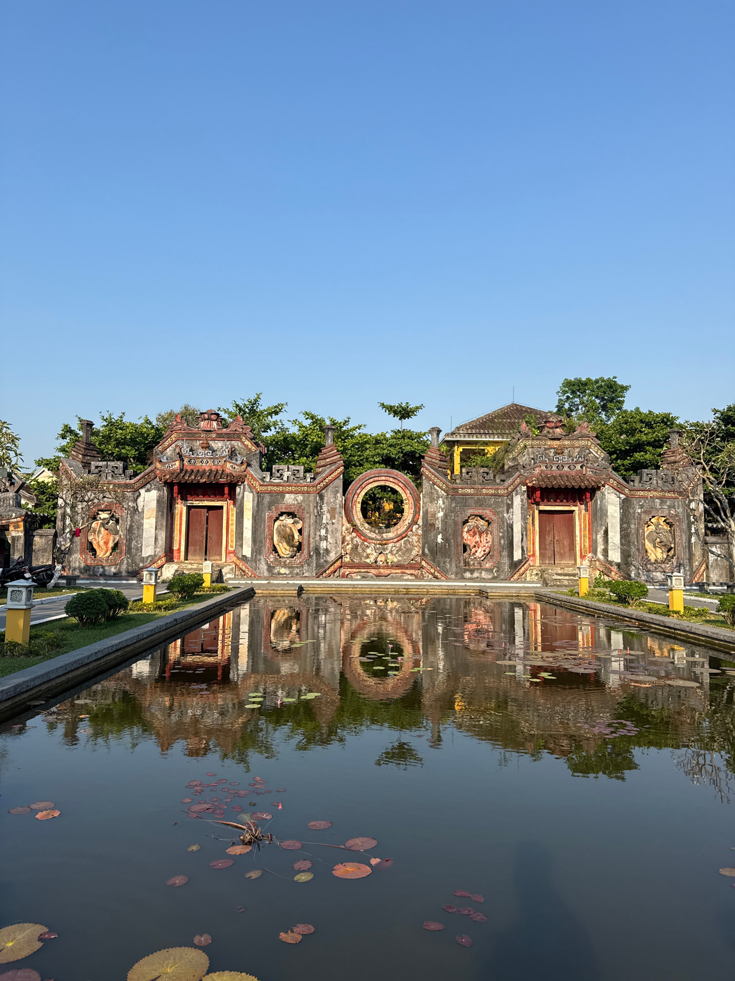 The image captures a building with traditional Vietnamese architectural elements reflected in a body of water. The building is multi-tiered, with ornate details and visible aging. There are circular w…read more