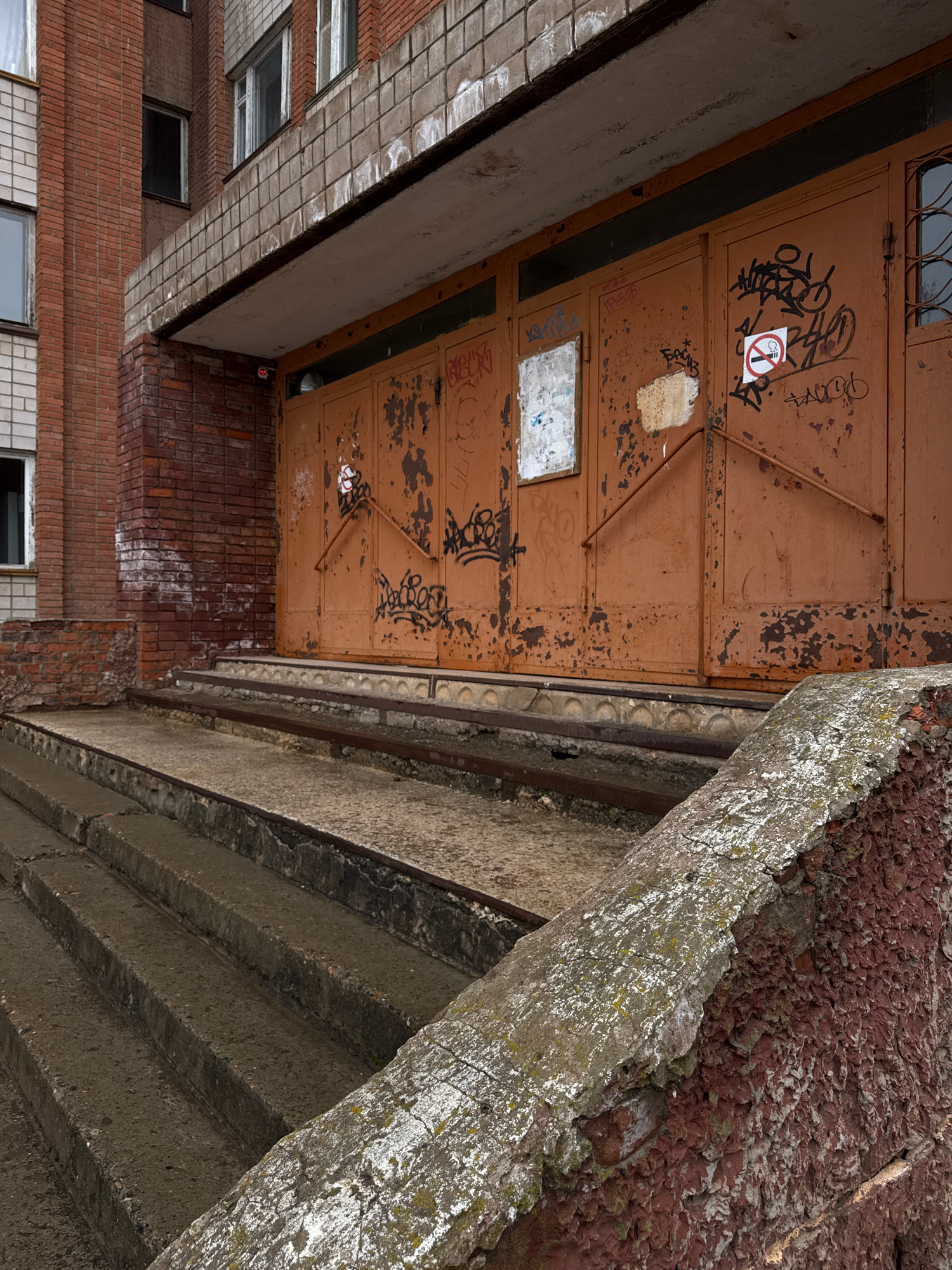 The image shows the underside of an architectural structure in Votkinsk, Russia. A rusted, orange-colored metal garage door with peeling paint and graffiti is visible. A "no smoking" sign is affixed t…read more