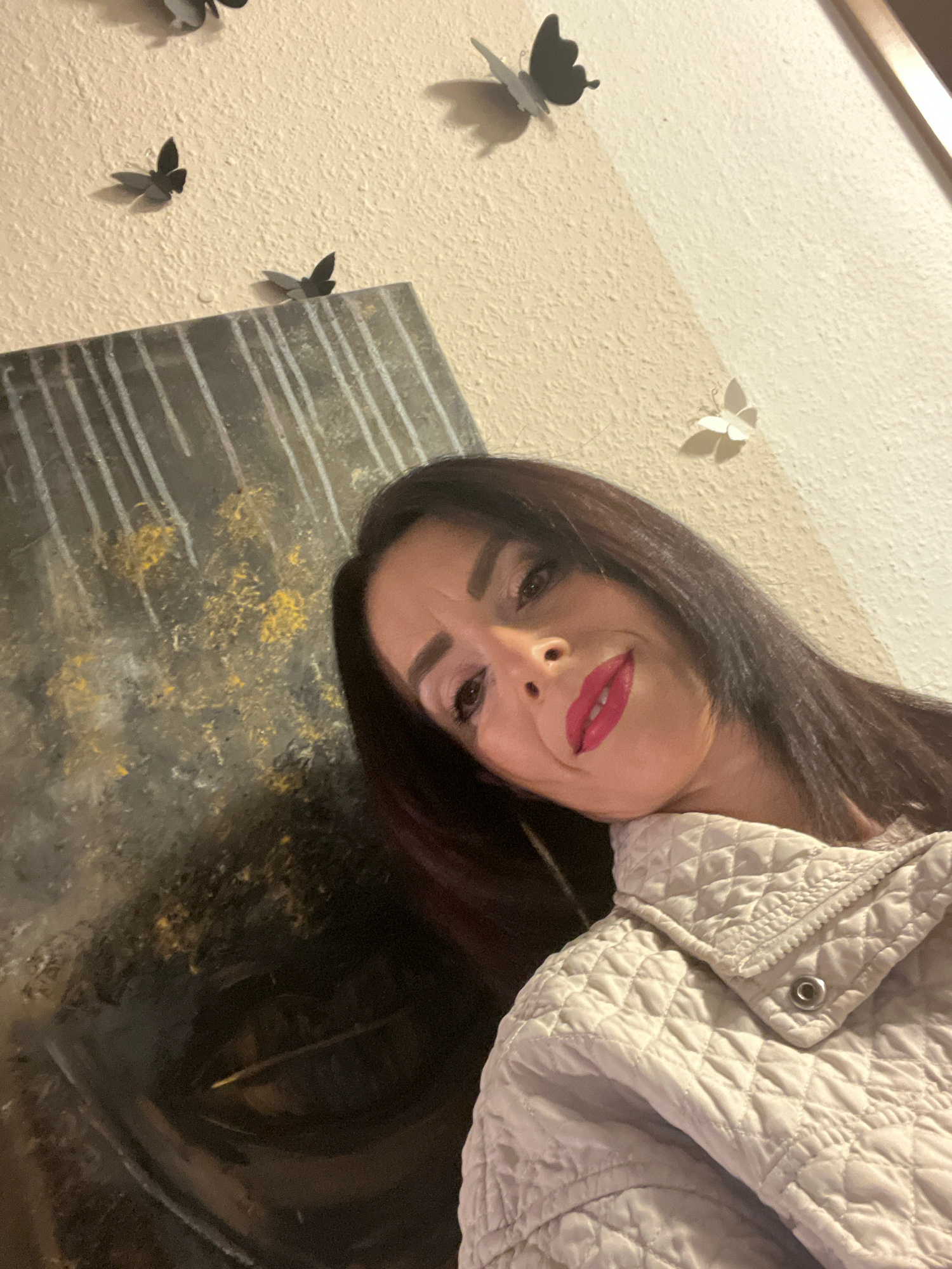 The image depicts a woman with dark hair, wearing a light-colored quilted jacket, indoors. Her face is turned towards the camera. Behind her, a wall with butterfly decorations and an abstract painting…read more