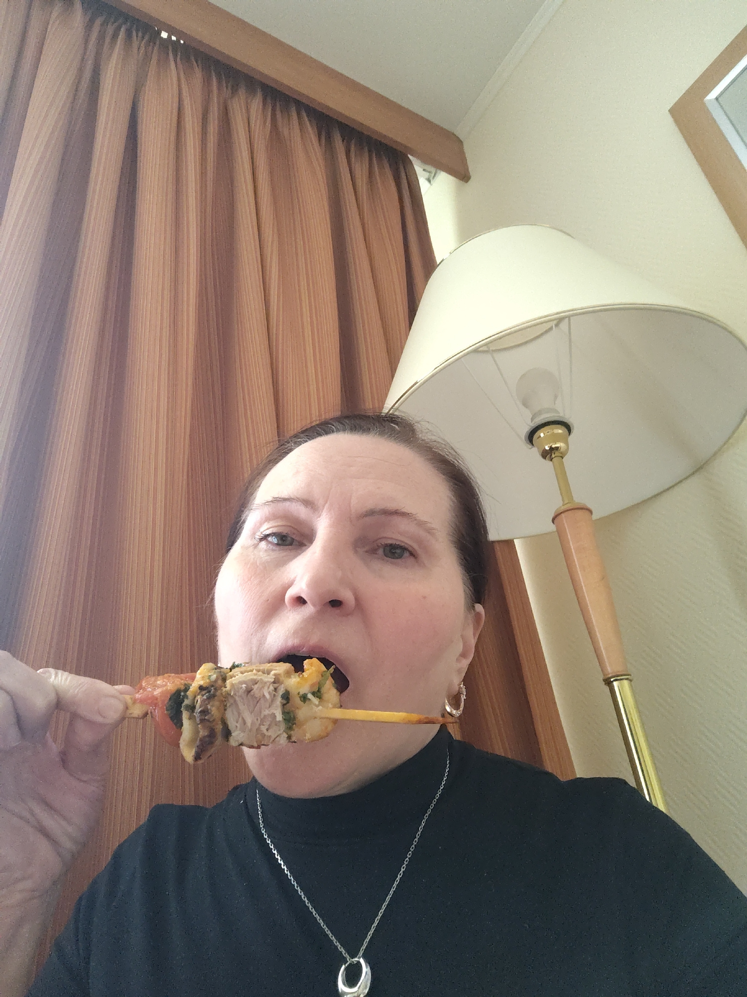 A medium close-up shot shows a woman indoors, appearing to take a selfie while eating from a skewer. She is positioned slightly off-center to the left, looking directly at the camera with her mouth op…read more