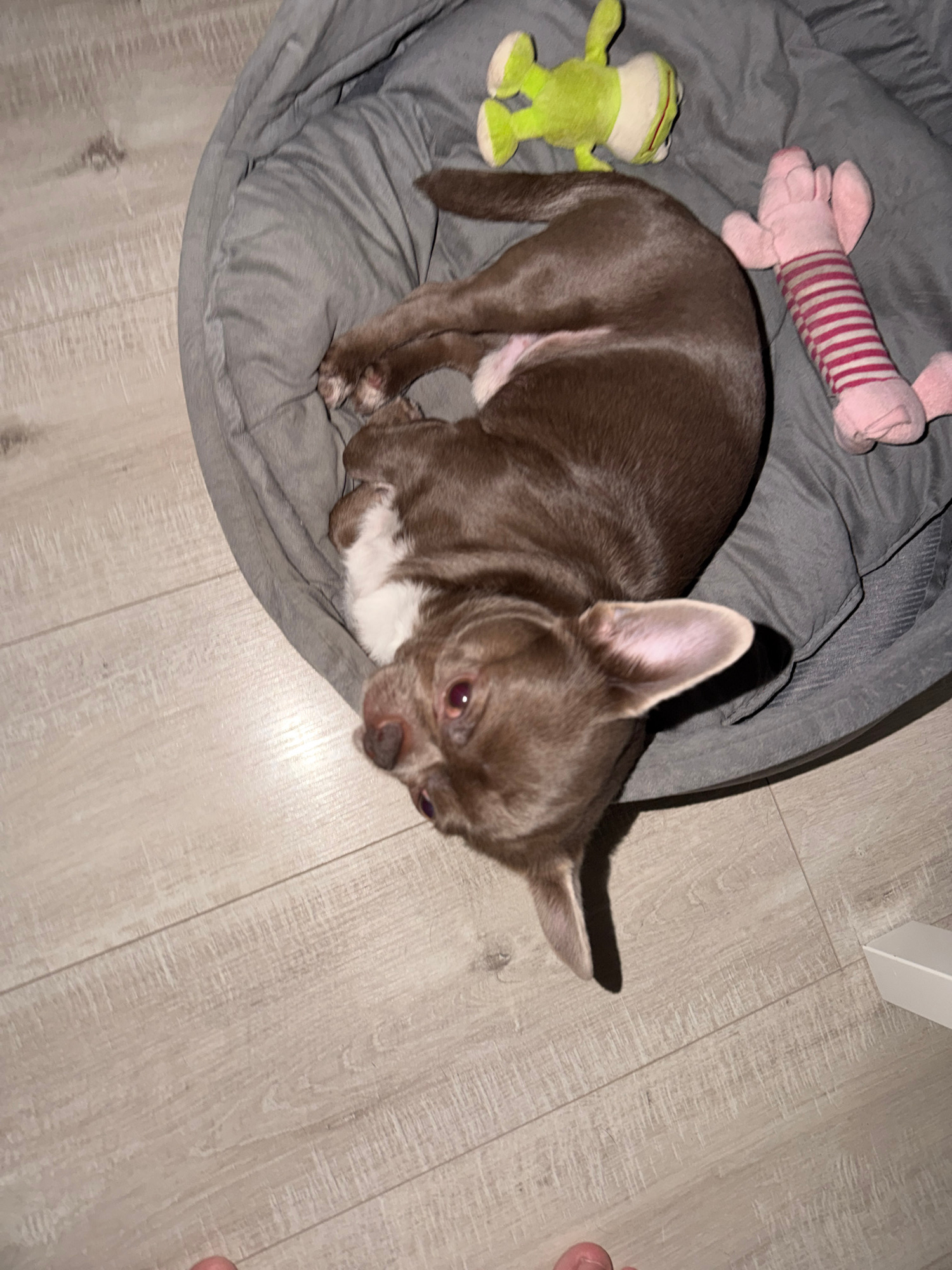 A chocolate-colored chihuahua with white markings on its chest rests in a gray dog bed. Beside the dog are two plush toys: a green frog and a pink pig with red stripes. The dog bed sits on a light-col…read more