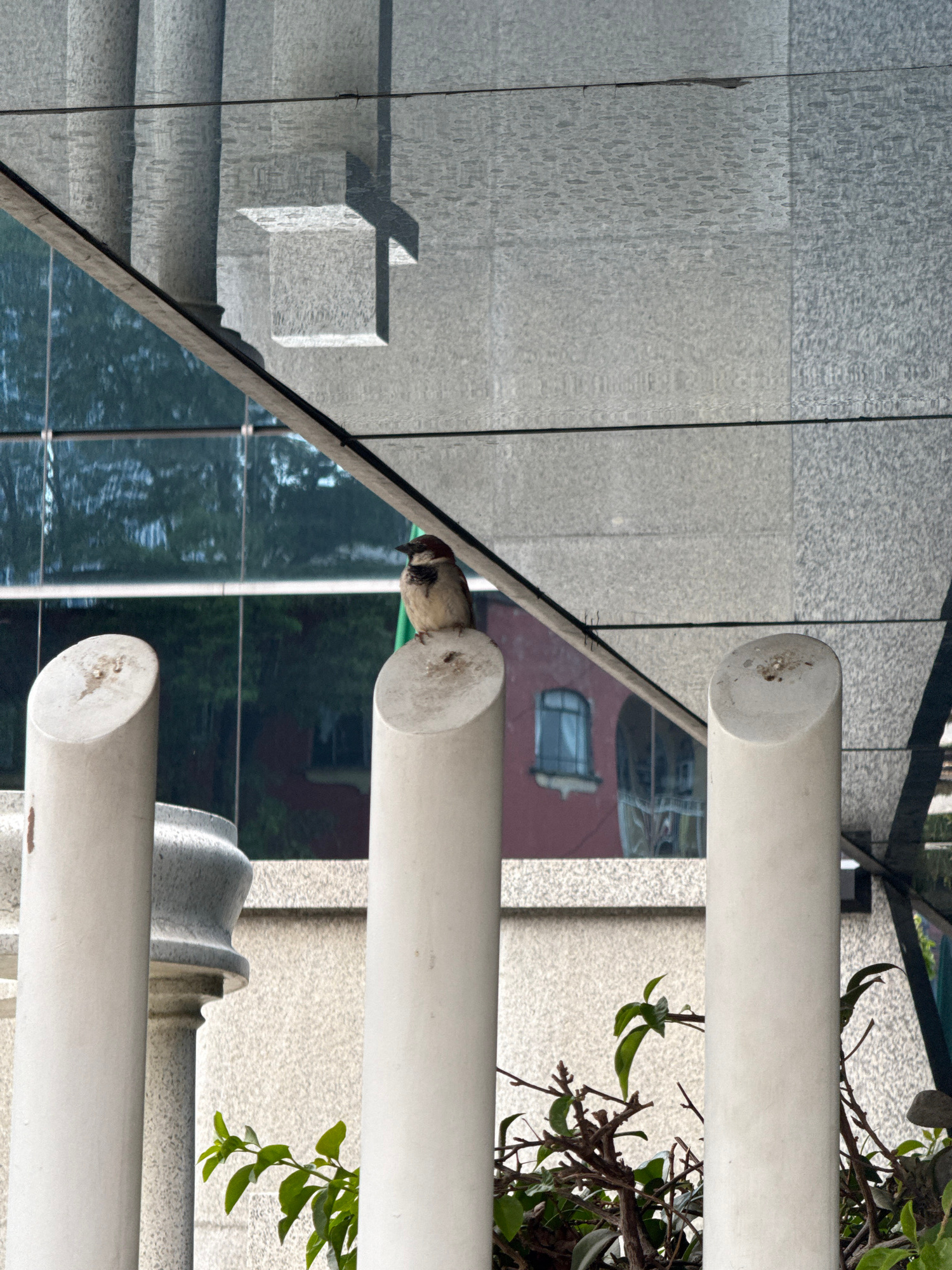 The image depicts an outdoor scene with architectural elements and a bird. The architecture includes white cylindrical pillars, stone steps, and a glass facade reflecting the surrounding environment.…read more