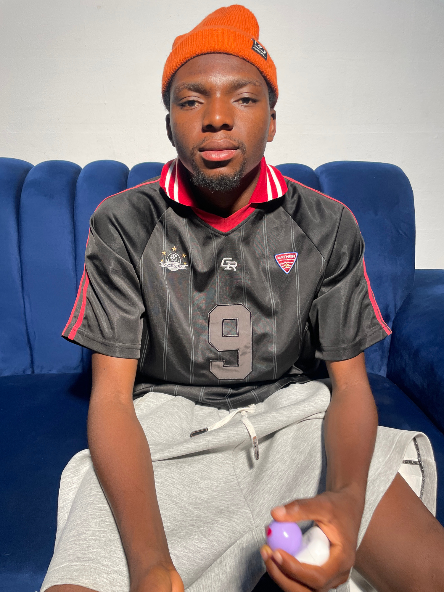 A young man is reclining on a blue couch. He is wearing an orange beanie, a black jersey with red trim and the number 6 on it, and gray sweatpants. He is holding a small, white object with a purple sp…read more