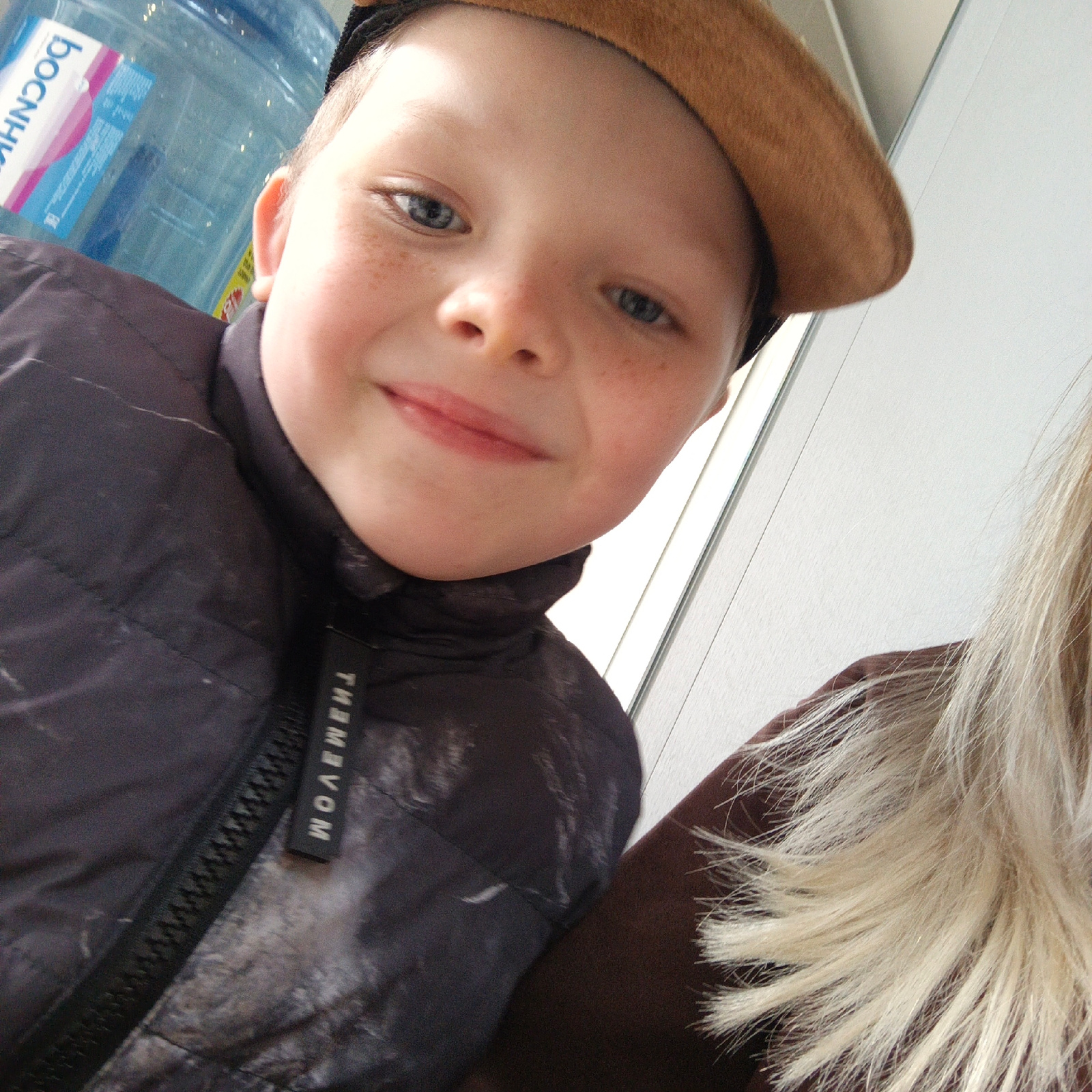 The image shows a close-up shot of a young boy with fair skin, freckles, and blue eyes. He is wearing a brown beret and a black, patterned jacket with a zipper that has a tag reading "MOVEMENT." A por…read more