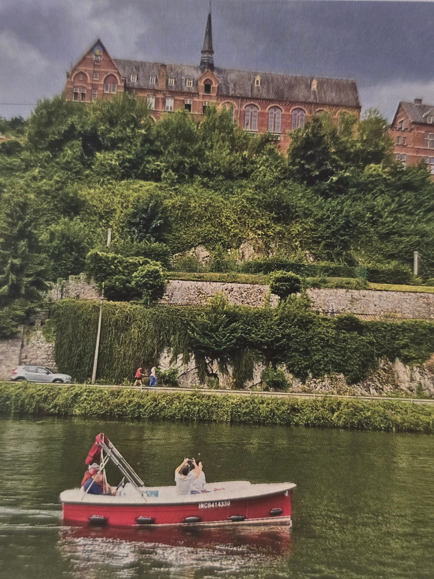 The image depicts a tranquil daytime scene along a waterway, likely a canal or river, set in Sofia, Bulgaria. The sky is overcast, casting a soft, even light over the landscape. On the right side ofโฆread more