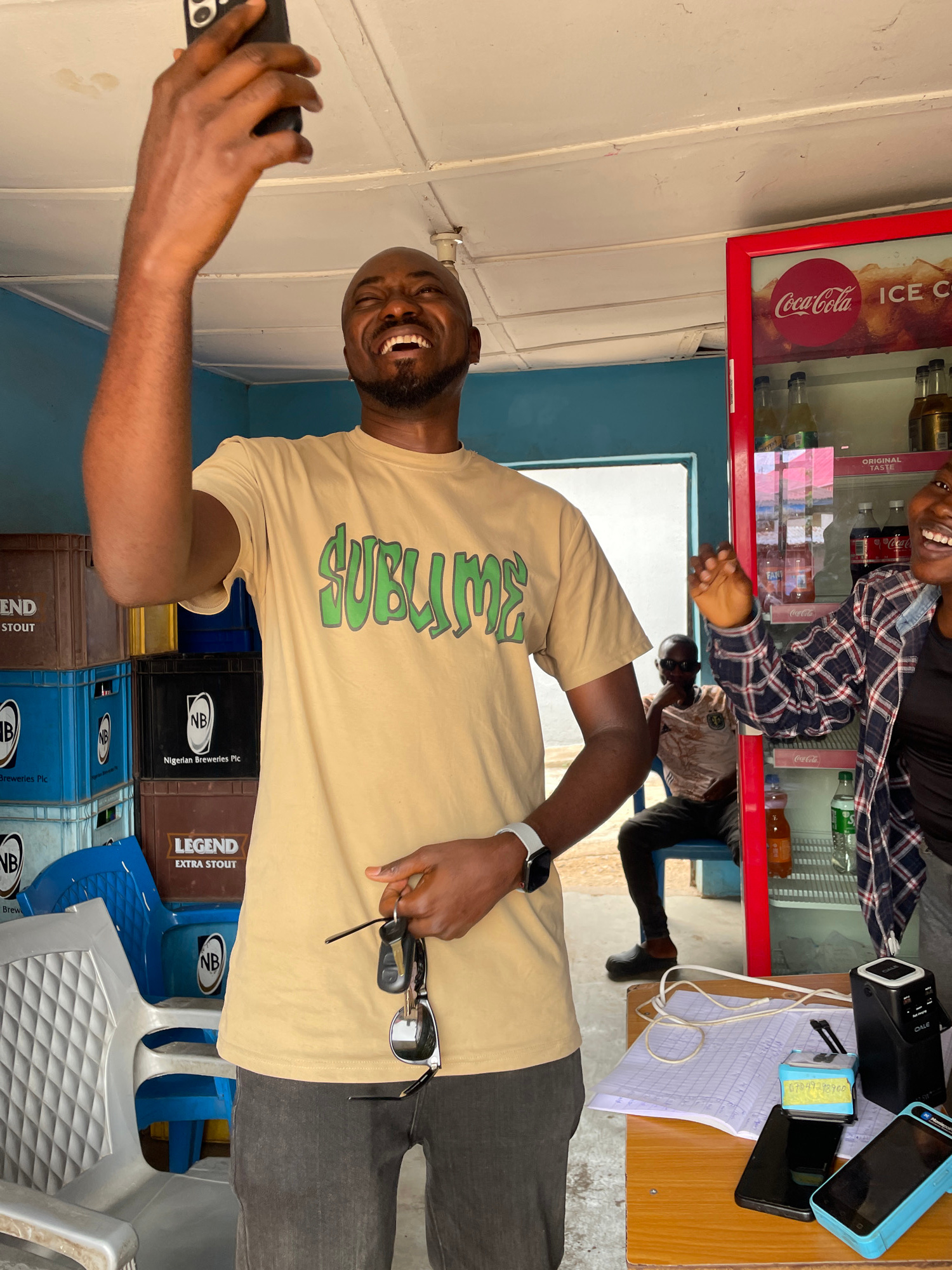A lively scene unfolds inside what appears to be a shop or convenience store in Jos, Nigeria, during the daytime. The primary subject is a smiling man with a beard, wearing a beige t-shirt with "SUBLI…read more
