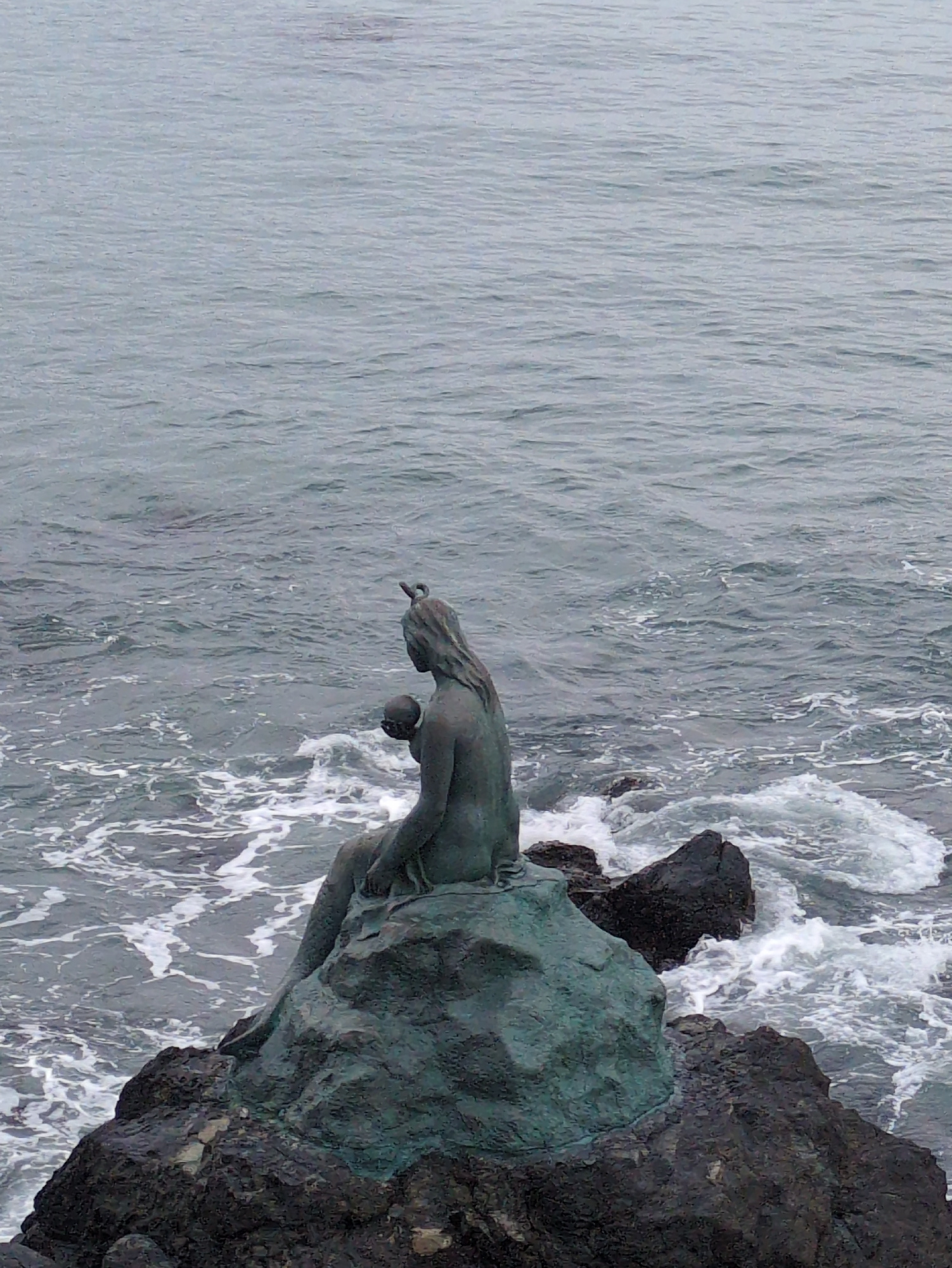 A statue of a woman with an apple perched on a rocky outcrop in Busan, South Korea. The statue has a greenish, weathered patina. The gray sea surrounds the rocks with white sea foam at the base of the…read more