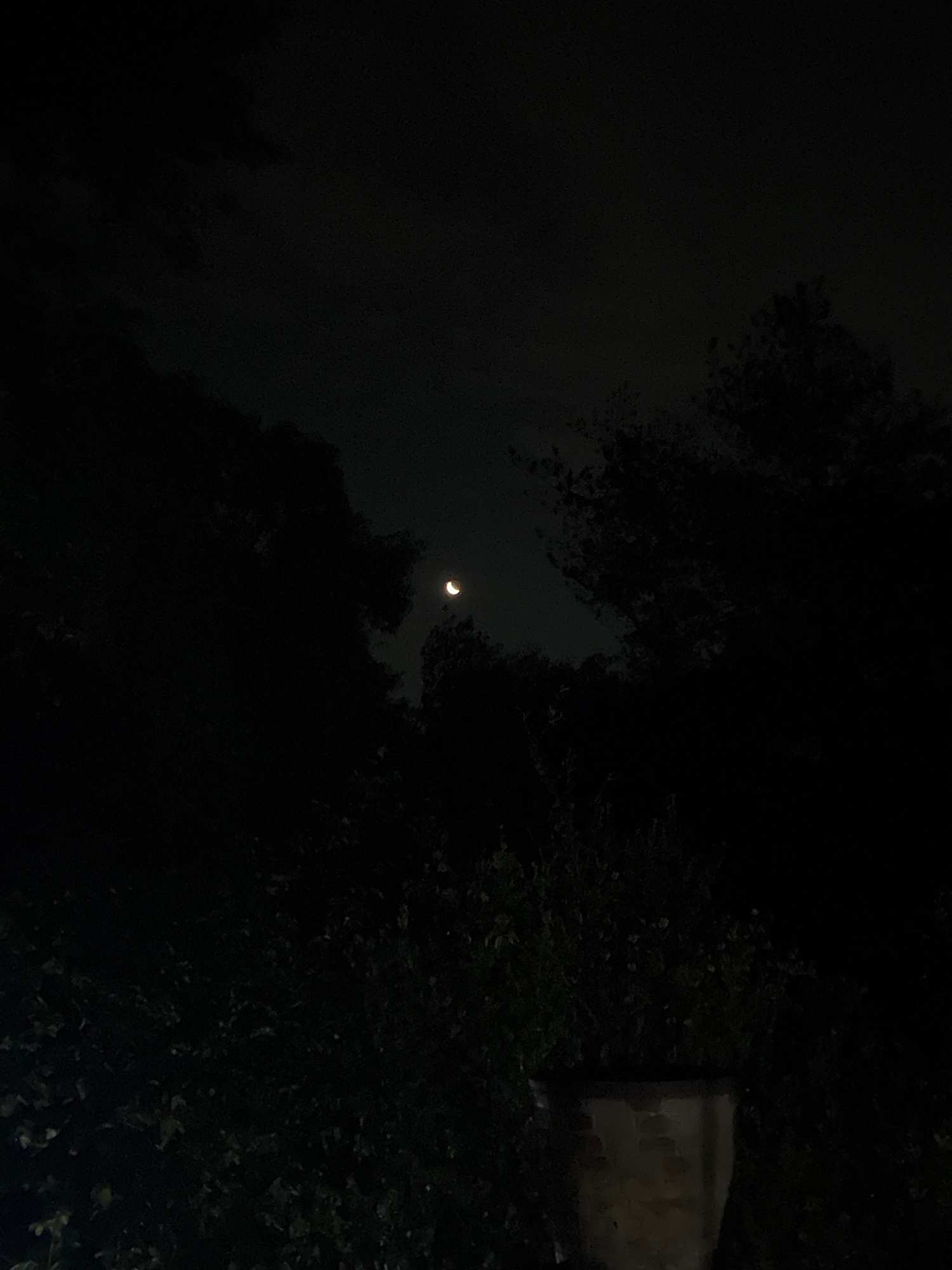The image presents a night scene in Cañada de Madero, Mexico. A crescent moon is visible in the dark sky, partially obscured by tree branches. The surrounding environment is shrouded in darkness, with…read more