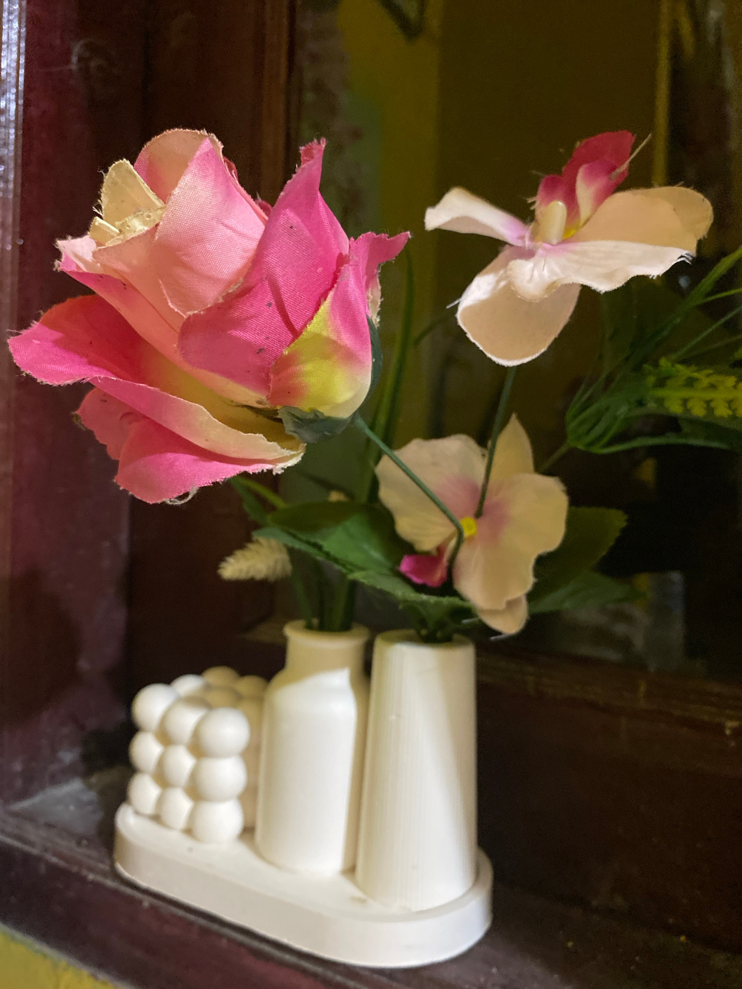 The image shows a floral arrangement in a white ceramic vase. The flowers include a pink rose, a white and pink orchid-like flower, and some green foliage. The arrangement is placed on a dark surface,…read more