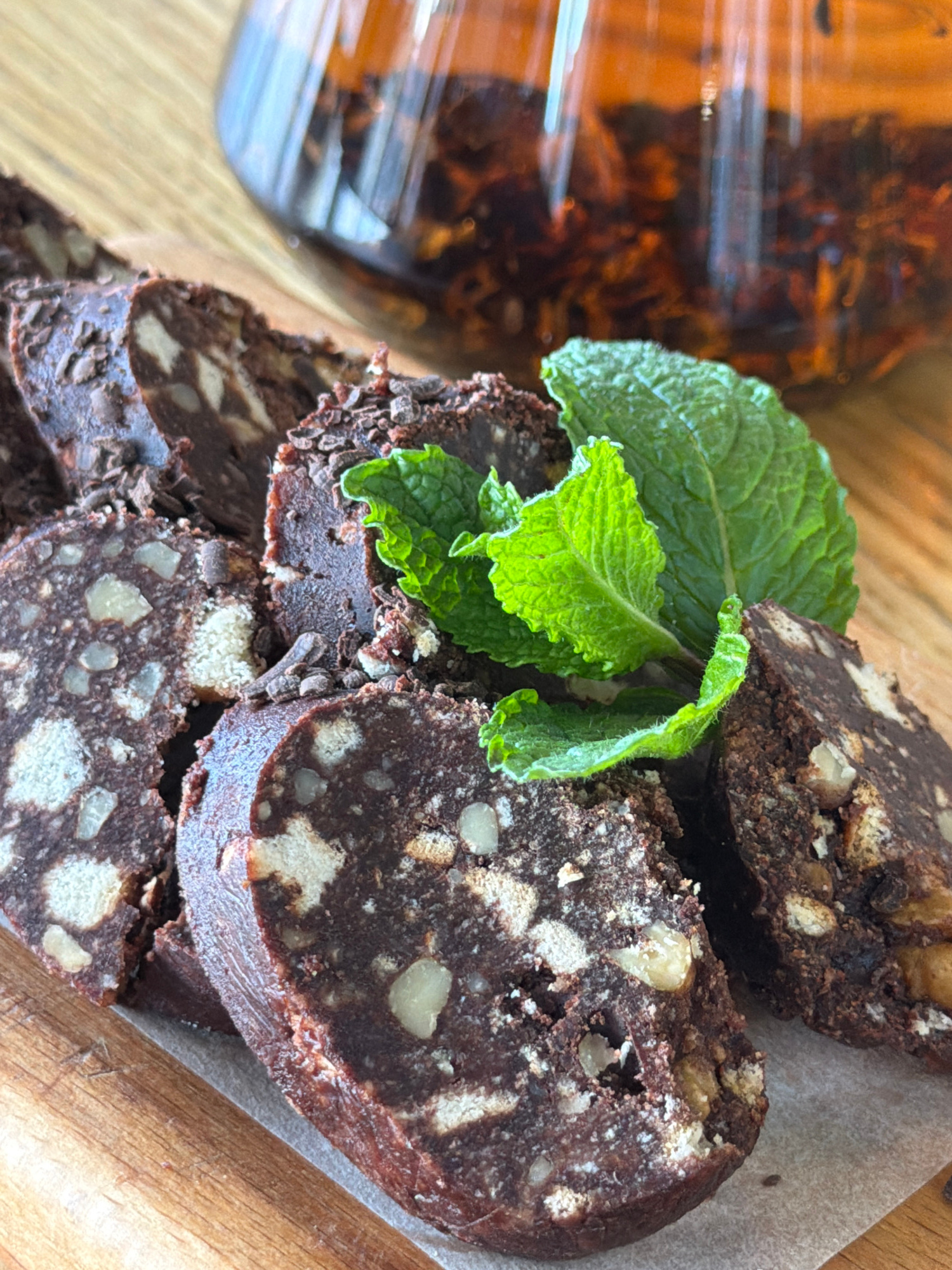 The image captures a close-up, slightly overhead view of sliced chocolate salami, or chocolate sausage, artfully arranged on a wooden surface. Several circular slices of the dark brown confectionery a…read more