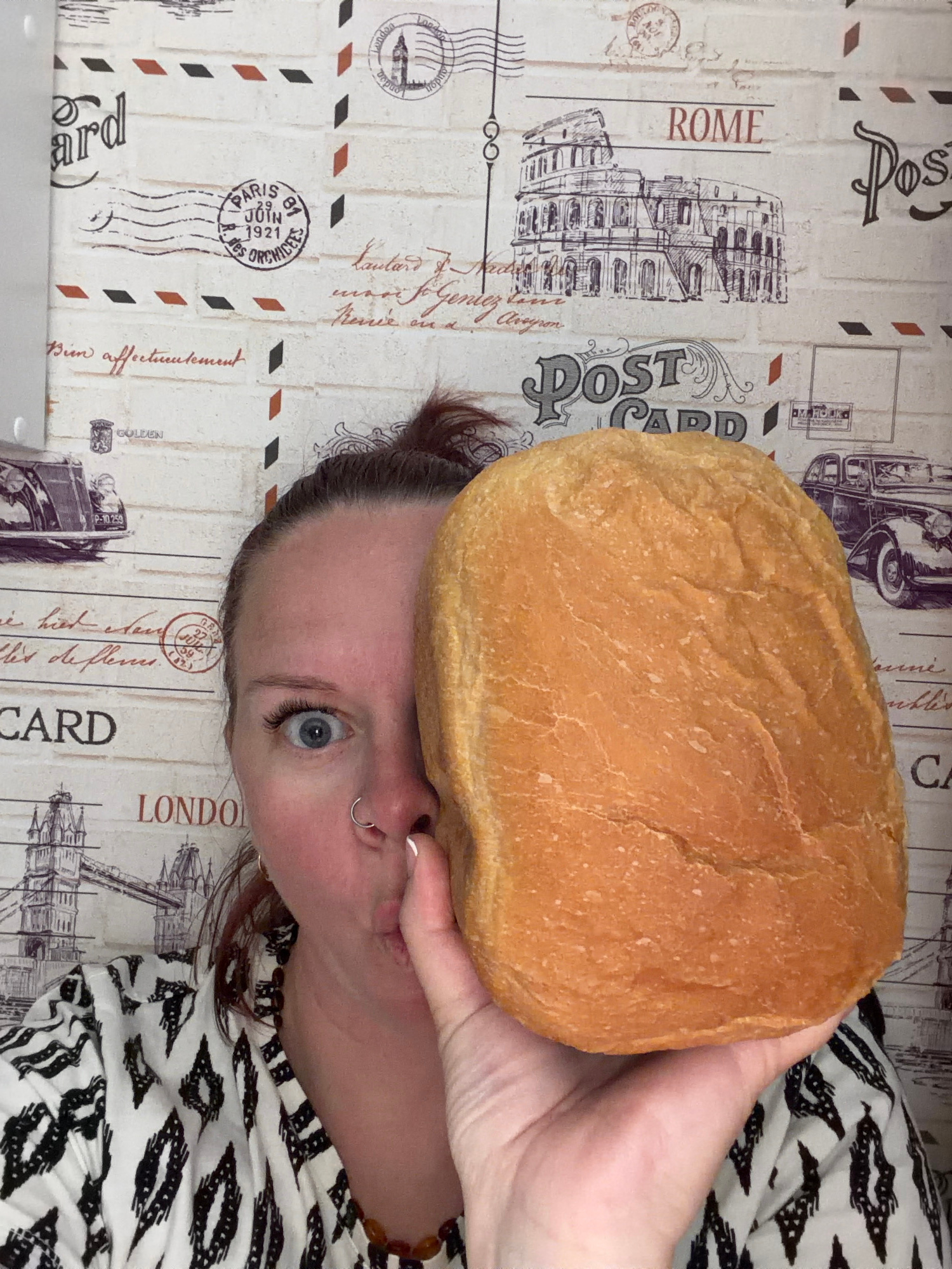 A person is playfully holding a fresh, golden-brown loaf of bread against their face, partially covering their nose and mouth, in a close-up indoor shot. The person, with fair skin, blue eyes, dark ha…read more